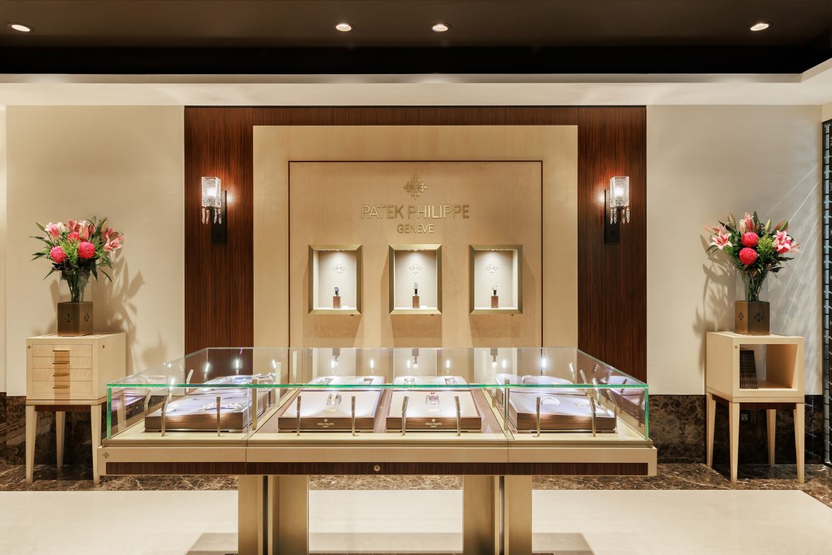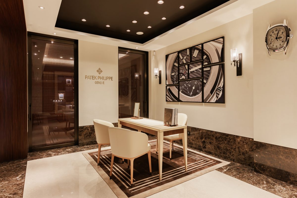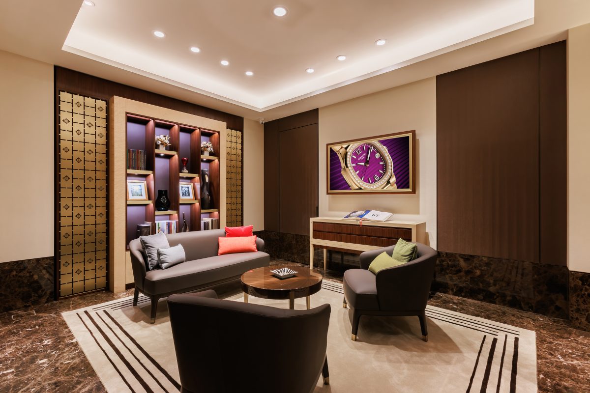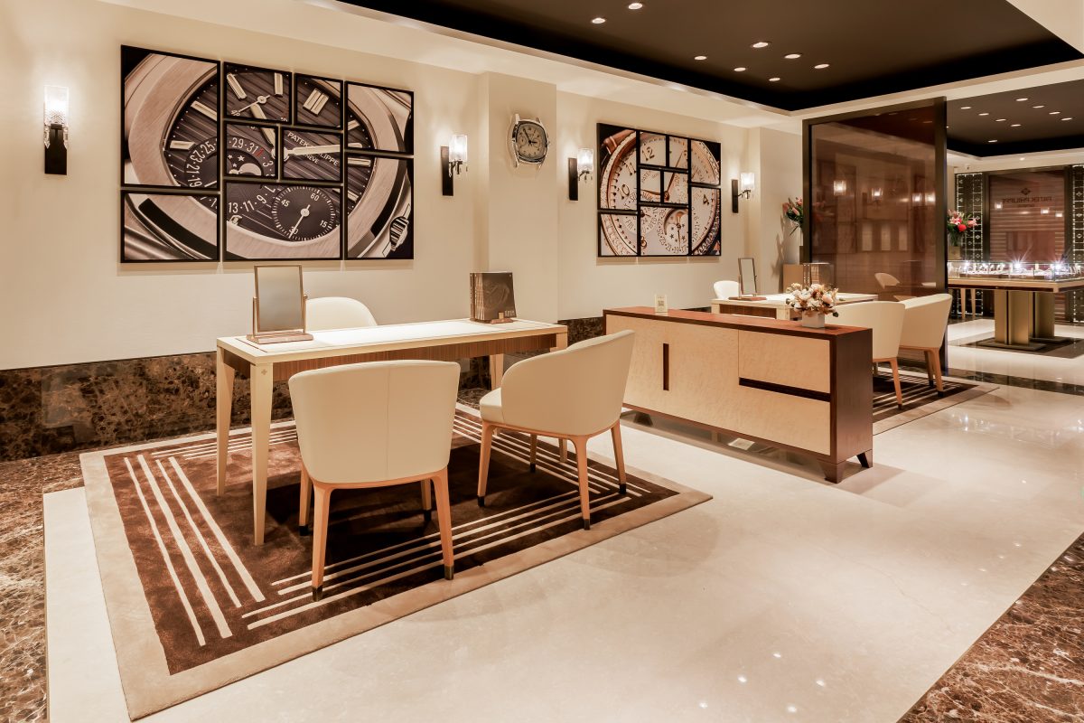 店內的設計貫徹百達翡麗價值恆久、工藝美學的理念,流露出一種低調雅緻,結合了鳥眼楓木、印度玫瑰木和復古磨光表面的黃銅金屬。首先,設計框架主體以精心選擇的鳥眼楓木製成,木紋如同鳥眼紋理一樣細緻而獨特,襯托著自然優雅的美感,木材質感和色澤在光影間交互輝映,讓設計感充滿溫潤大氣。
