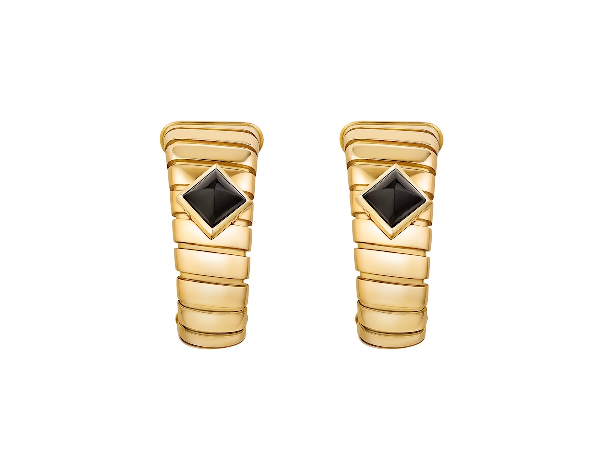 耳際處,安.海瑟薇點綴了 Tubogas 系列 黃 K 金縞瑪瑙鉚釘耳環。金黃色澤與深邃縞瑪瑙的強烈對比,勾勒出極具現代感的摩登輪廓。