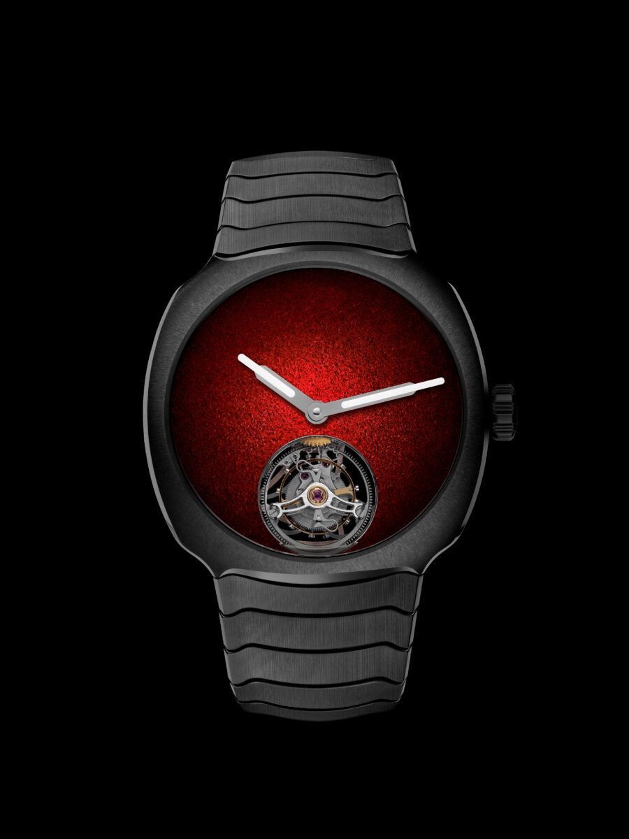 在低調內斂的陶瓷外殼包裹下,是極具視覺衝擊力的紅色煙燻大明火琺瑯錶盤。品牌秉持「Concept」概念系列的極簡靈魂,完全捨棄了時標與標誌,將舞台留給了那如熾熱岩漿般的紅。製作團隊在白金底板上雕刻出細膩的錘擊質感,並透過多次繁複的洗滌、研磨與高溫燒製工序,使琺瑯顏色呈現出深邃且永不褪色的漸層光彩,展現出高級製錶界罕見的色彩深度。