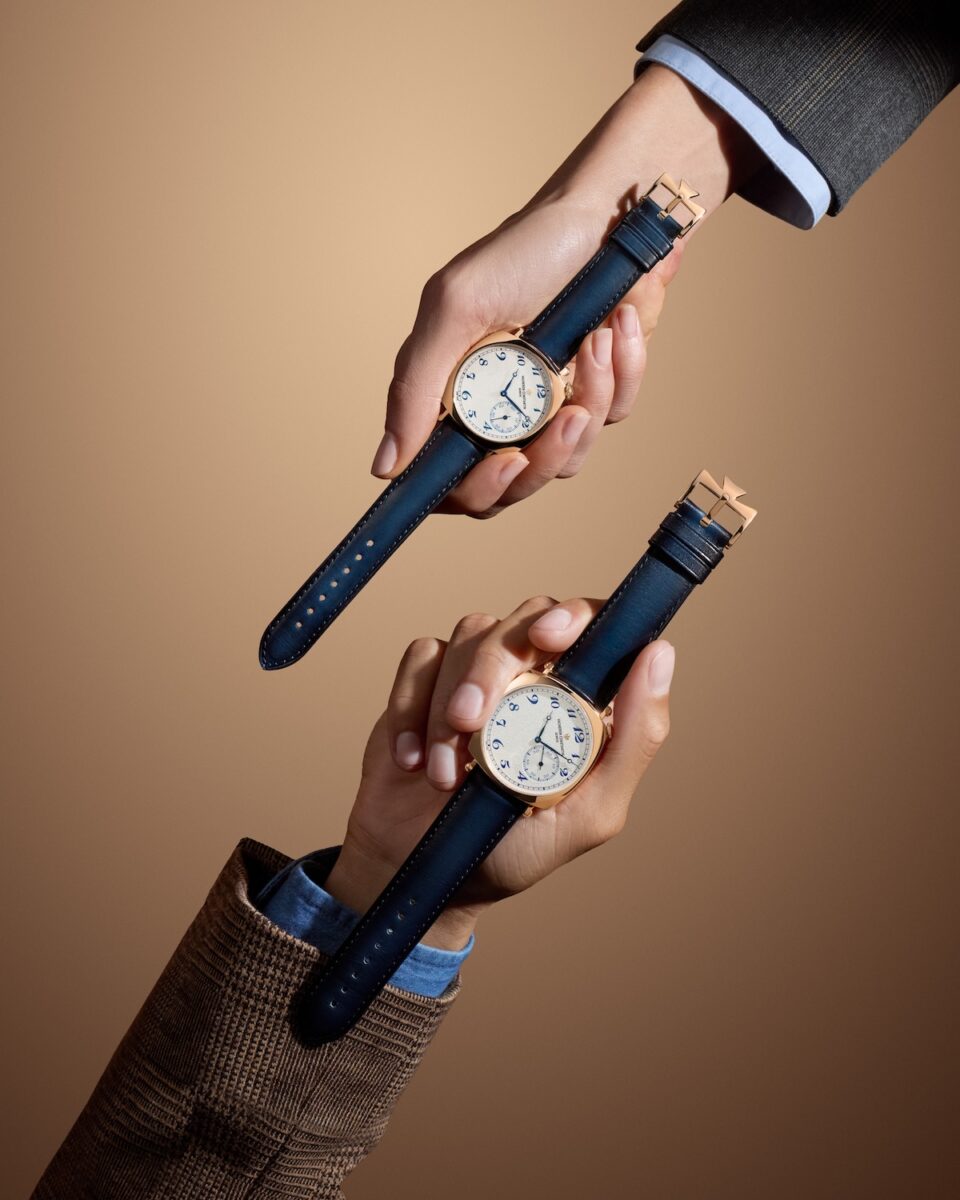 這款腕錶最引人入勝之處,在於其打破常規的非對稱設計。枕形錶殼內,錶盤與機芯均呈 45 度偏轉佈局,搭配位於錶殼右上方角落的獨特錶冠,這種不拘一格的美學配置,最初源於 1919 年江詩丹頓為駕駛愛好者開發的「司機腕錶」。這種巧妙的設計讓佩戴者在握持方向盤或傳道演講時,無需轉動手腕即可優雅且精準地讀取時間。全新版本在保留這份自在風尚的同時,特別於銀色粒紋裝飾錶盤上點綴亮藍色阿拉伯數字時標與金質指針,與經過做舊處理、呈現漸變效果的深藍色小牛皮錶帶相互映襯,展現出既簡約優雅又富有視覺張力的當代美學效果。