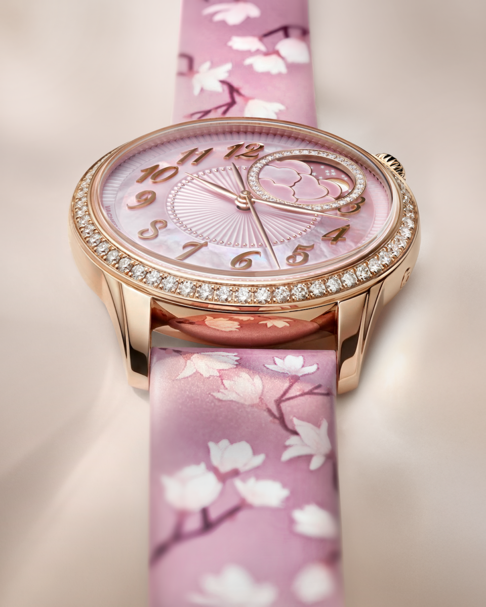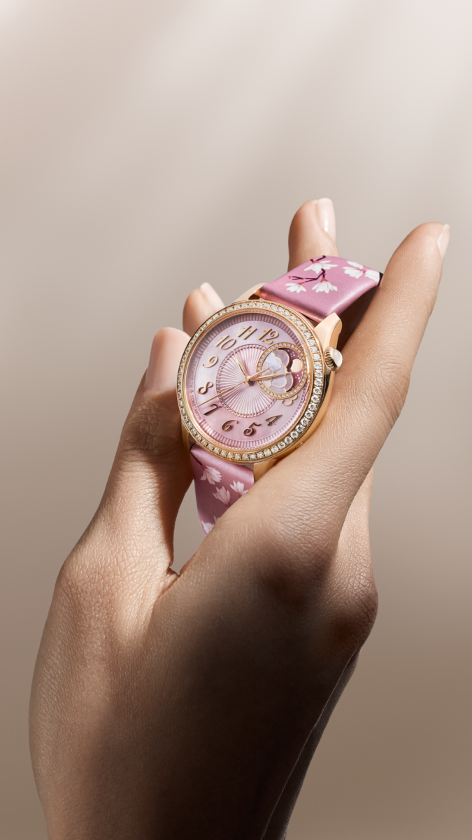 標誌性的偏心式月相顯示設於 1 點與 3 點鐘位置之間,金質月亮在珍珠貝母雲朵後若隱若現,與鑲嵌月光石的錶冠相映成趣。錶圈與小錶盤共鑲嵌 94 顆明亮式切割鑽石,總重約 1.10 克拉,如同繁花上的露珠般熠熠生輝。除了手工微繪錶帶外,品牌更貼心附贈覆盆子粉色亮面鱷魚皮與胭脂粉色羅紋織物兩條可快速替換錶帶,讓佩戴者能隨心情與穿著自由變換風格。