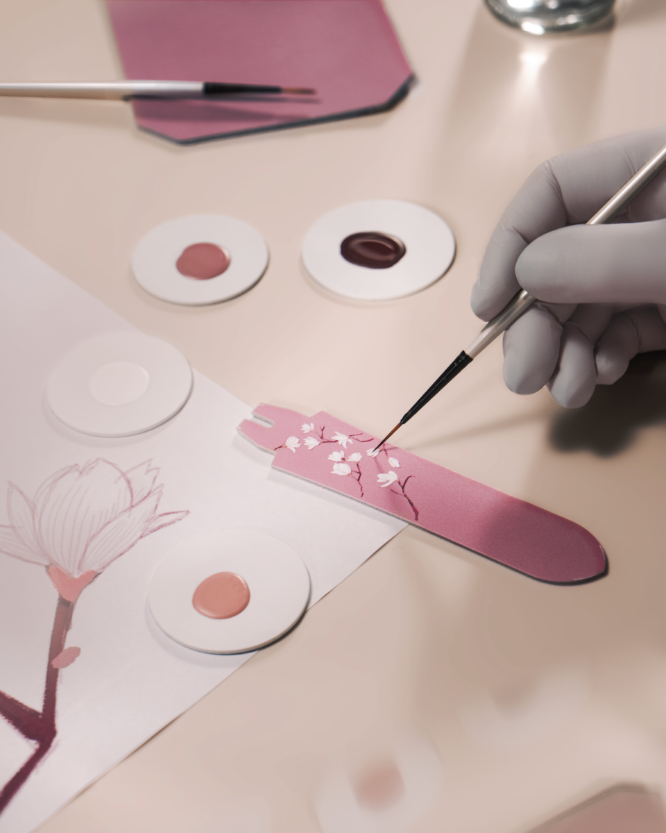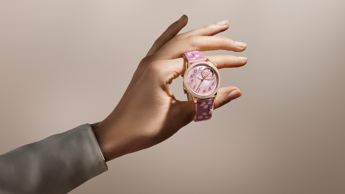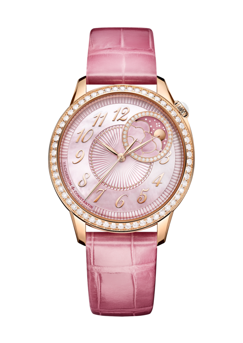 新作最引人矚目之處,在於江詩丹頓首度將微繪工藝由錶盤延伸至錶帶之上,在柔軟的粉色粒面小牛皮上,由工藝師親手繪製精緻繁複的花卉圖案,使每一枚限量編號的時計皆因手工筆觸的細微差異而成為世上獨一無二的藝術臻品。