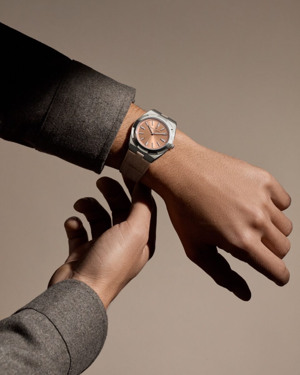 視覺上,三文魚色漆面錶盤展現了豐富的工藝層次,中央的旭日紋緞面裝飾與外緣的天鵝絨質感刻度圈相互映襯,展現出強烈的當代氣息,同時也向 1940 年代江詩丹頓的經典美學致敬。18K 白金鑲貼時標與指針皆覆有藍色 Super-Luminova® 夜光塗層,確保在任何光影環境下皆能清晰讀時。