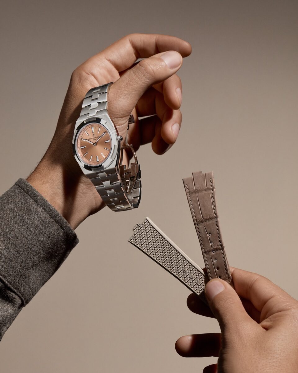 除了卓越的技術與設計,這款腕錶亦傳承了 Overseas 系列著名的靈活性與多樣性。除了原配的 950 鉑金錶鏈外,品牌更隨附一條米色橡膠錶帶及一條具備「絨面觸感」的深卡其色鱷魚皮錶帶,透過無需工具的快速替換系統,佩戴者可隨心所欲切換運動與正式風格。透過透明藍寶石水晶錶底蓋,佩戴者可盡情欣賞 2550 機芯精美的手工潤飾,包括飾有風向玫瑰羅盤圖案的鉑金微型擺陀、飾以日內瓦條紋的板橋,以及點綴圓形粒紋的主夾板。