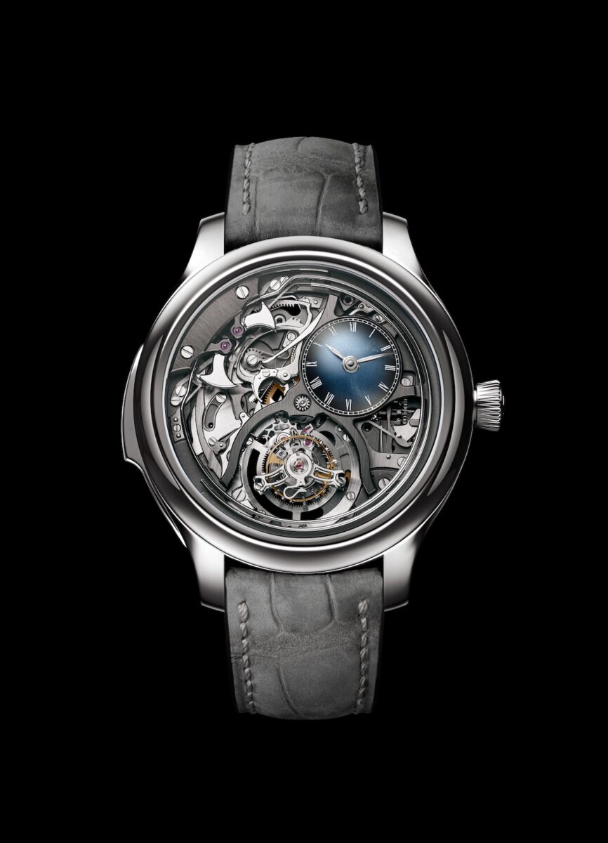 在 H. Moser & Cie. 亨利慕時的世界裡,複雜功能從不甘於隱身幕後,而是應該在聚光燈下被看見、被傾聽。這種對工藝透明度的執著,在勇創者三問報時圓柱陀飛輪鏤空腕錶中達到了巔峰,為了實現這種視覺上的巔峰,製錶師對機芯進行了徹底的空間重構,將弧形音簧精確地配置在同一平面,並與鏤空橋板交織成一種充滿張力的平衡感。