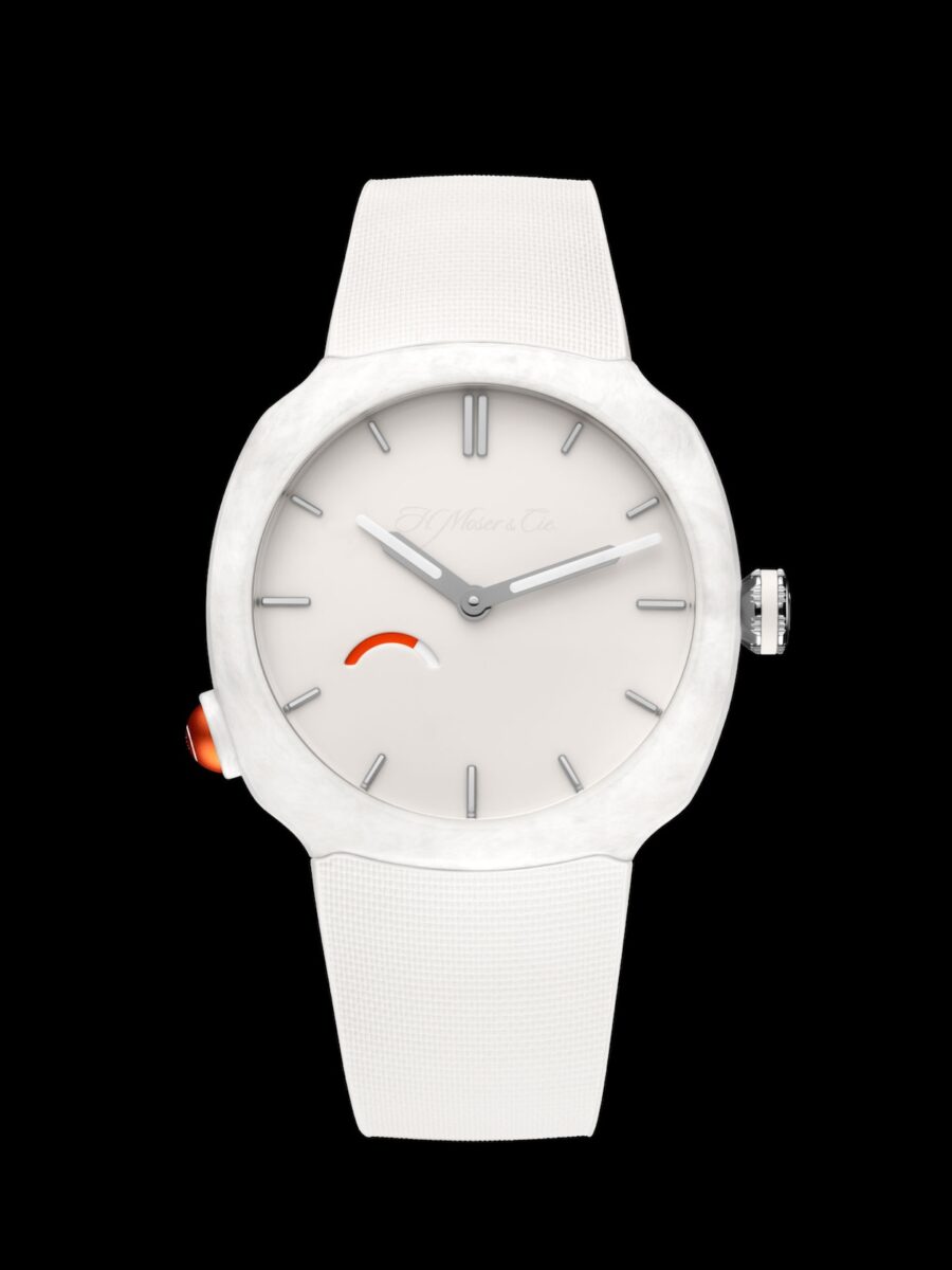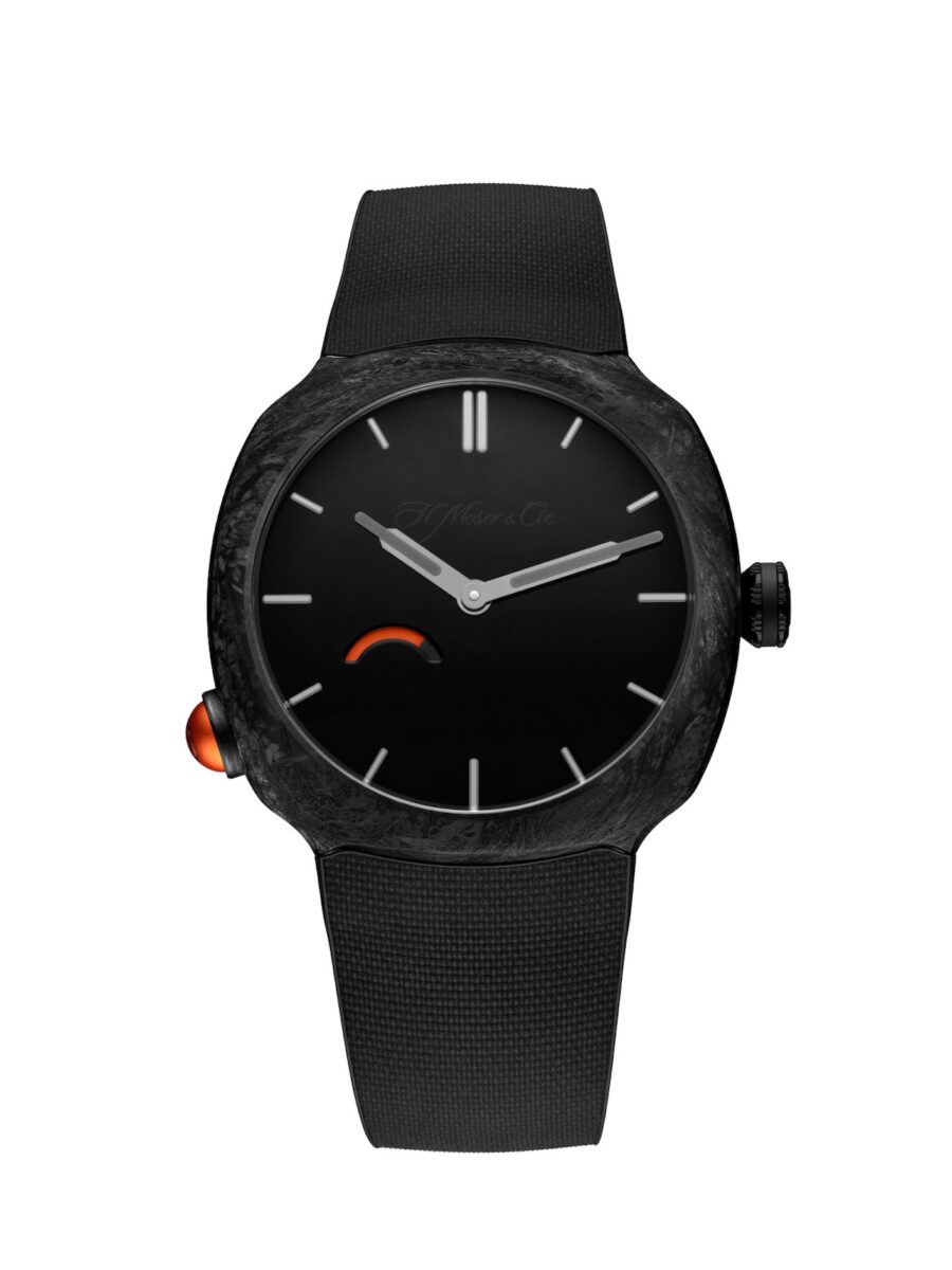 內嵌的鈦金屬「盔甲式」外骨骼不僅確保了 100 米的防水性能,更讓這枚 11.4 毫米厚的腕錶在視覺存在感與佩戴輕盈度之間取得了完美平衡。無論是純粹漆面的黑白錶盤,還是散發綠色光芒的 Globolight® 指針,都與那抹顯示動力儲存的橘色圓盤相映成趣,讓高級製錶在追求技術巔峰的同時,重新找回了令人會心一笑的「酷小子」叛逆。這場跨界合作最終在專屬球鞋與腕錶的迴響中閉環,證明了在 Moser Exploration LAB™ 的創意空間裡。