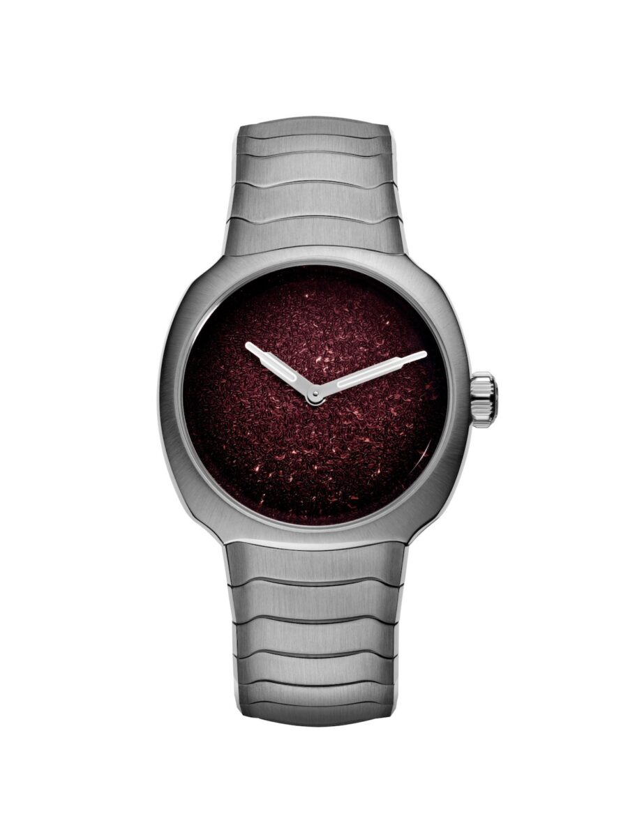 為了提煉出時間最純粹的動態之美,腕錶採用了極簡的雙針設計,剔除秒針與時標的干擾,將視覺重心完全留給那片如夢似幻的錶盤。冰霜紋理源自繁複的手工雕刻工藝,在黃銅底板與漸變漆面的交織下,呈現出銀色與酒紅色的深邃光澤。當光線掠過表面,折射出的粼粼波光猶如暖陽灑落在靜謐雪地,隨著佩戴者的轉動閃耀不息。為了守護這份絕對的留白,品牌標誌被刻意省略,僅透過覆以夜光塗層的指針維持清晰的辨識度。