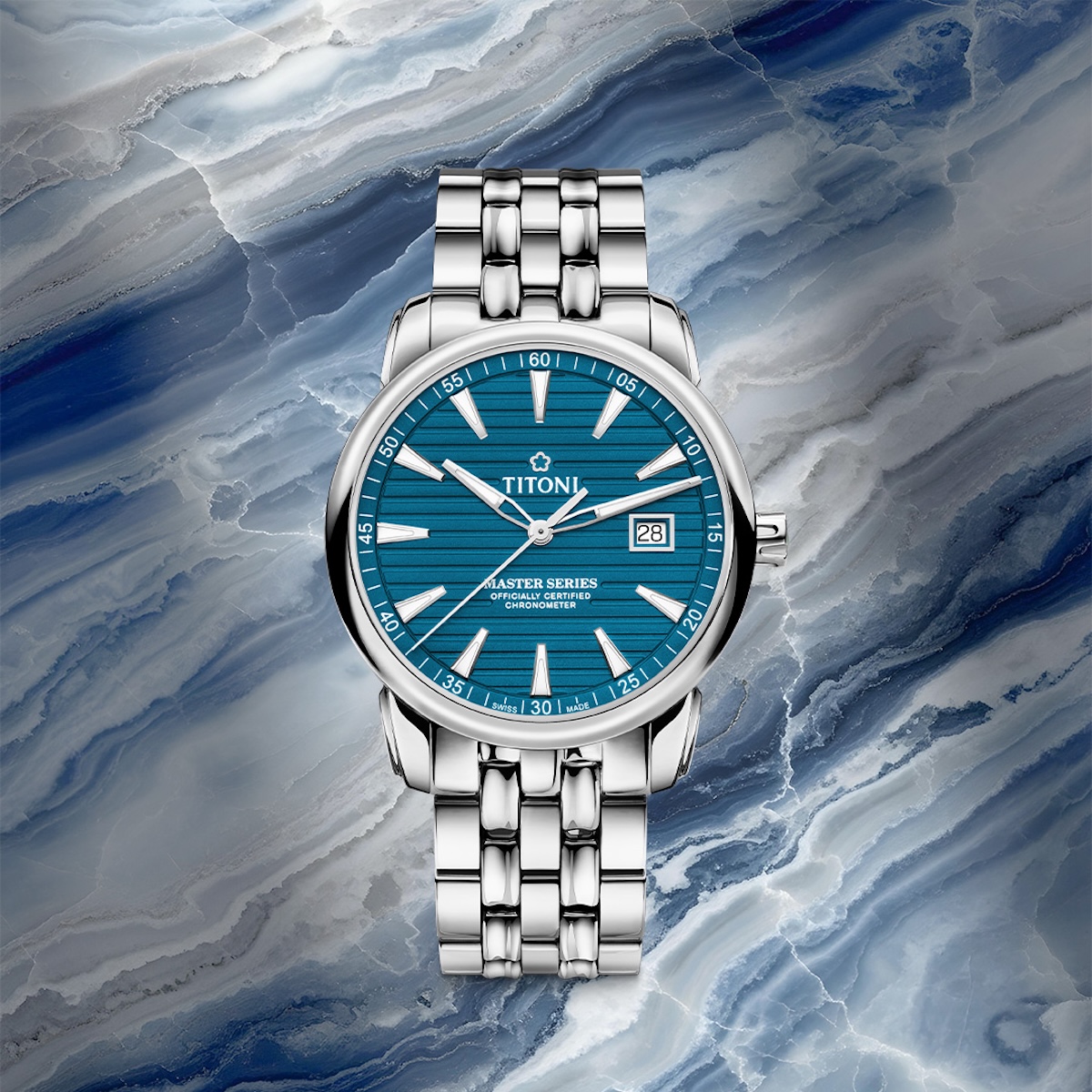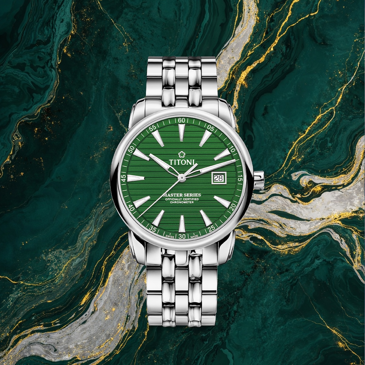 為了演繹不同的人生航道,TITONI 特別推出三款各具魅力的錶盤色調。銀白色錶盤宛如晨光灑落的平靜海面,散發純粹且歷久彌新的經典魅力,是穩健航行者的首選。森林綠錶盤則帶著深邃的生命力,彷彿航向秘境島嶼的奇幻航程,展現獨特的個性品味。而象徵理性的海洋藍錶盤,則如夜航中的廣闊海域,展現現代紳士面對未知挑戰時的沉穩氣度。