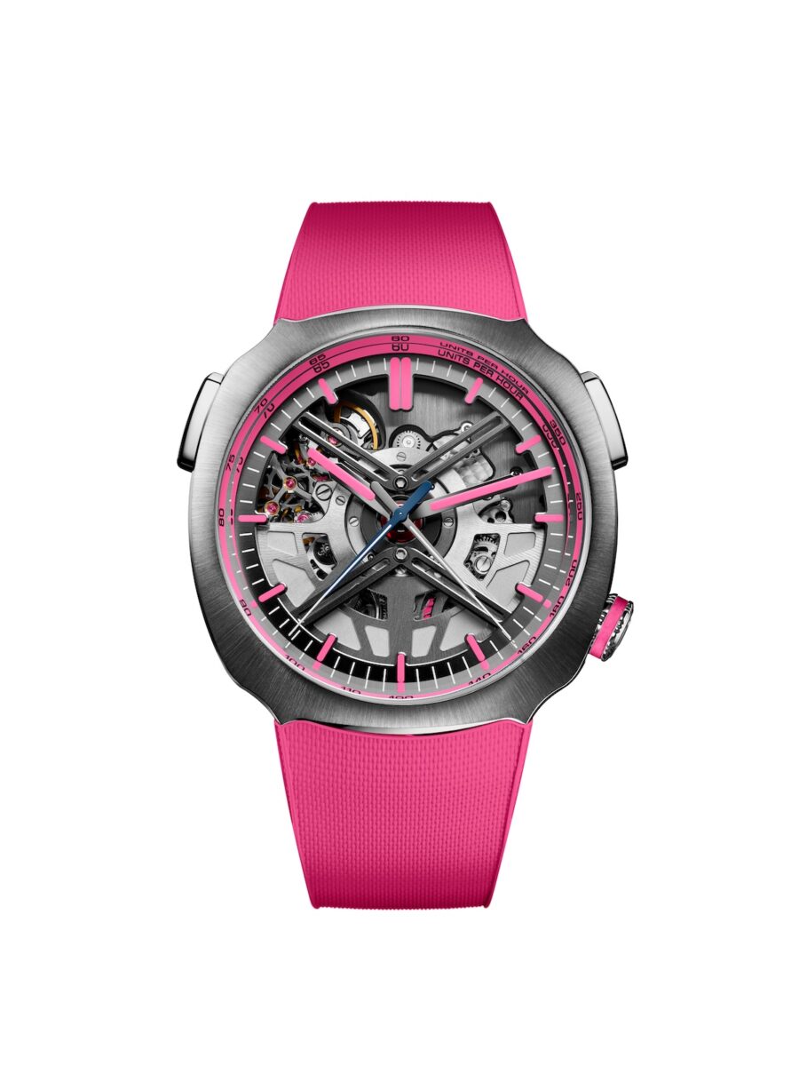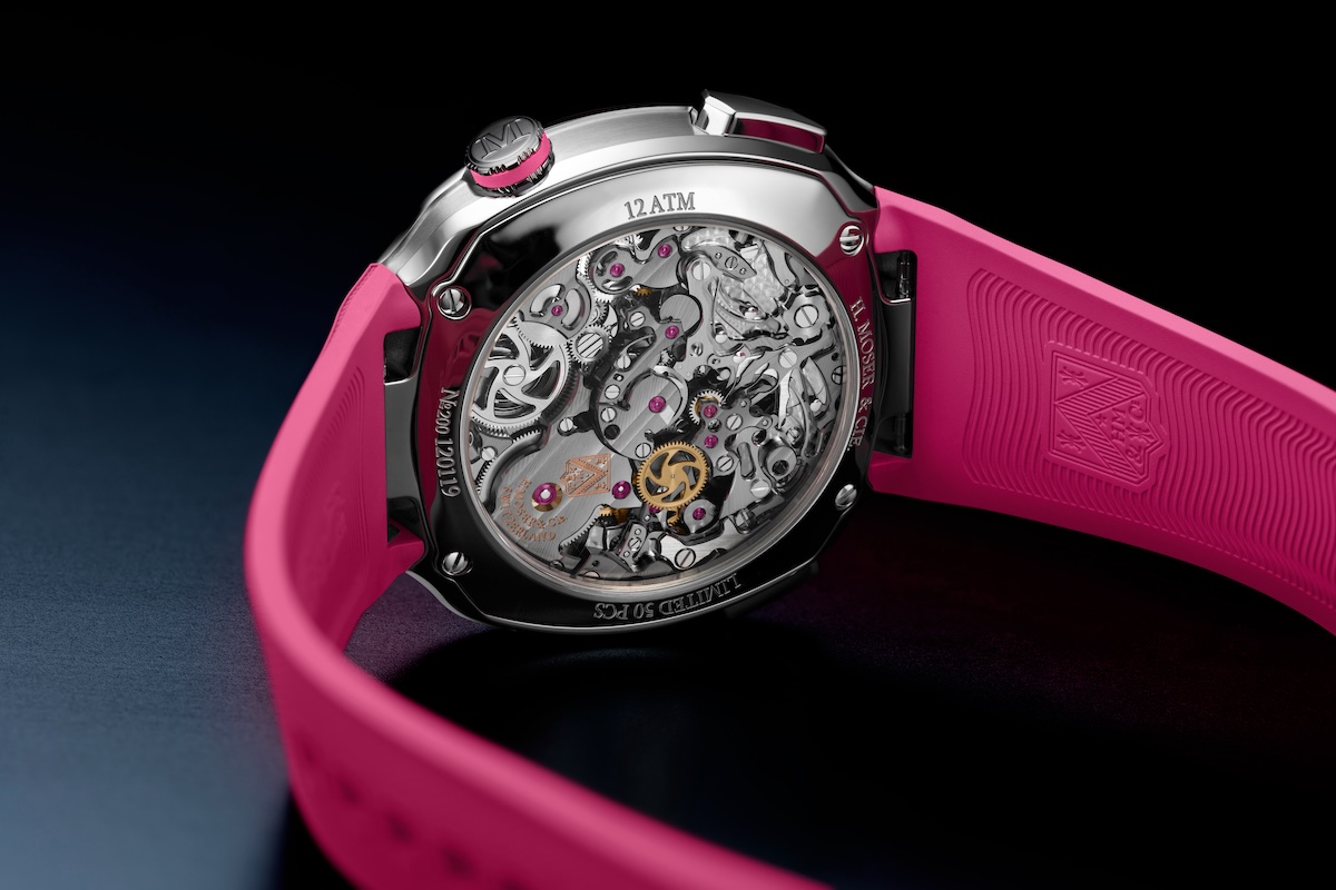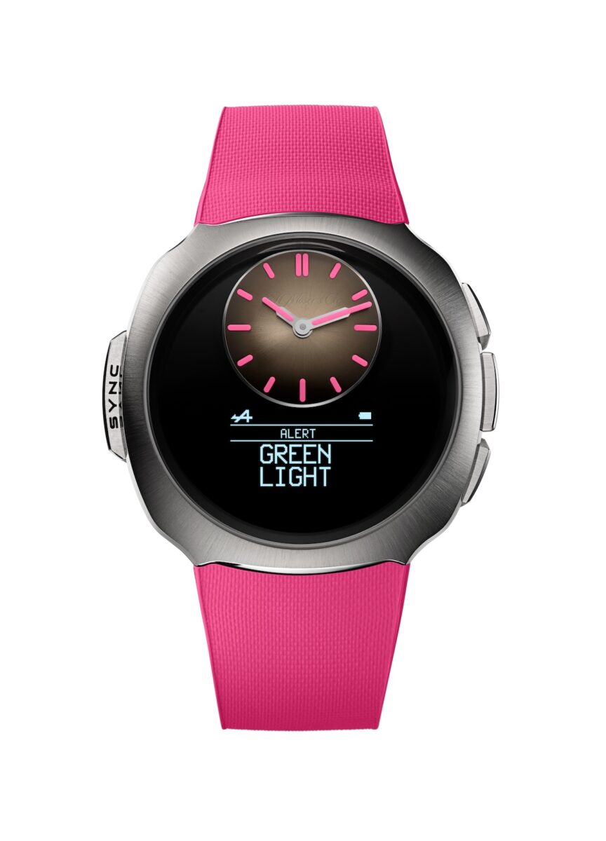 此次合作的深度遠超視覺層面,自 2025 年雙方深化夥伴關係以來,亨利慕時便不斷思考如何將兩百年的瑞士製錶傳統,轉化為現代賽車隊追求精準的實質助力。首先亮相的「疾速者 Alpine 車手款粉紅色特別版」搭載了與 Agenhor 共同研發的 HMC 700 鏤空飛返計時機芯,開放式錶盤讓齒輪運作一覽無遺,如同賽車透明車身展現的精密結構,粉紅色的時標與指針在每一次瞬間重置的飛返功能中,精準捕捉賽道上的熱度與刺激。
