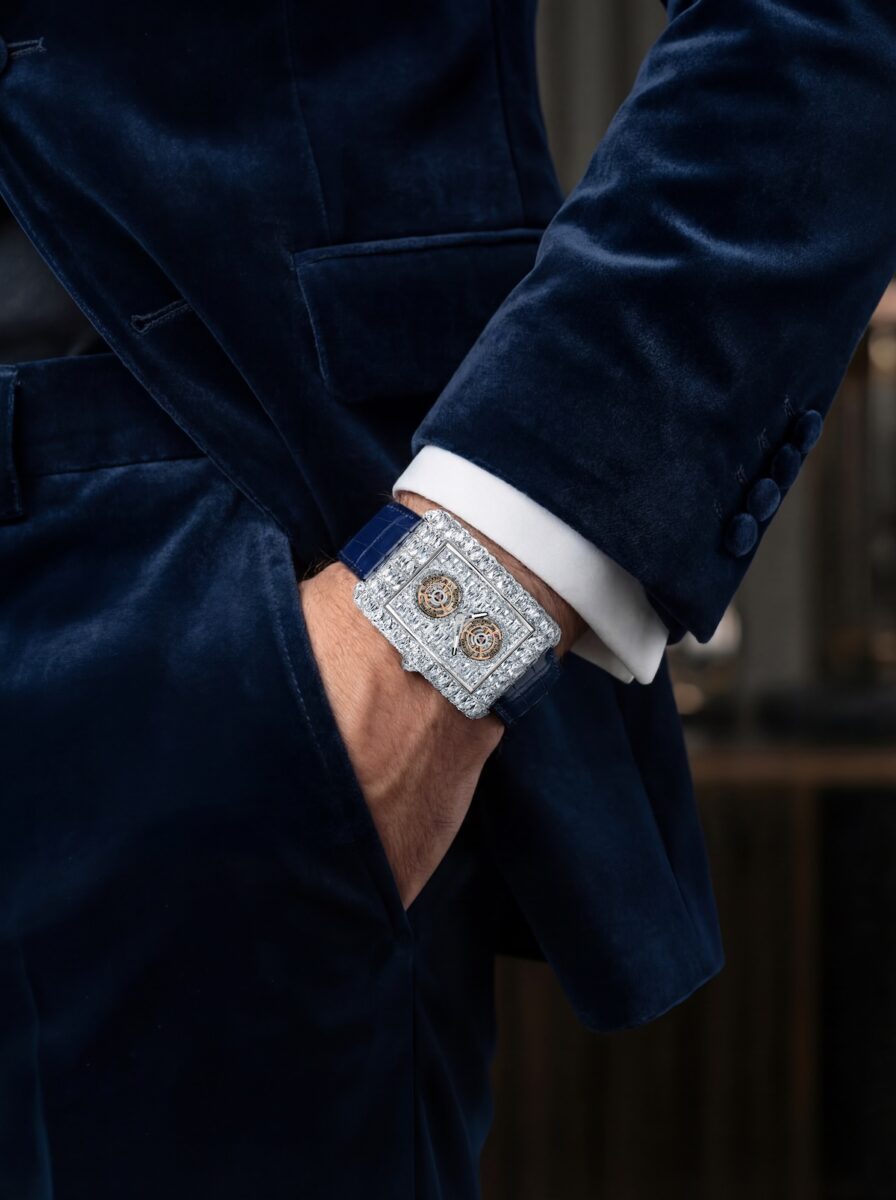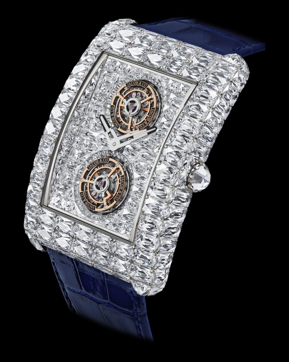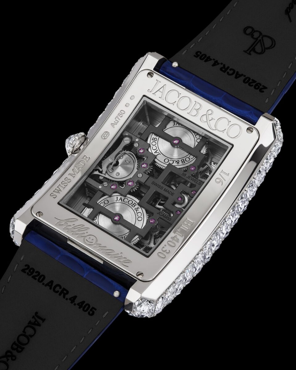 為了慶祝這項專利技術的問世,Jacob & Co. 隆重推出全球限量僅 18 枚的 Billionaire Double Tourbillon Angel Cut 雙陀飛輪腕錶。這枚尺寸為 54 x 41 毫米的白金傑作,全錶鑲嵌 298 顆、總重高達 79 克拉的白鑽,其中錶殼所採用的 98 顆 Angel Cut 鑽石皆具備主鑽等級規格。在熠熠生輝的鑽石盔甲之下,跳動著由 460 個零件組成的 JCAM50 手動上鏈機芯,其分佈於 12 點與 6 點鐘位置的雙飛行陀飛輪,與錶面的光學對稱設計交相輝映,交織出律動與璀璨的雙重美學。