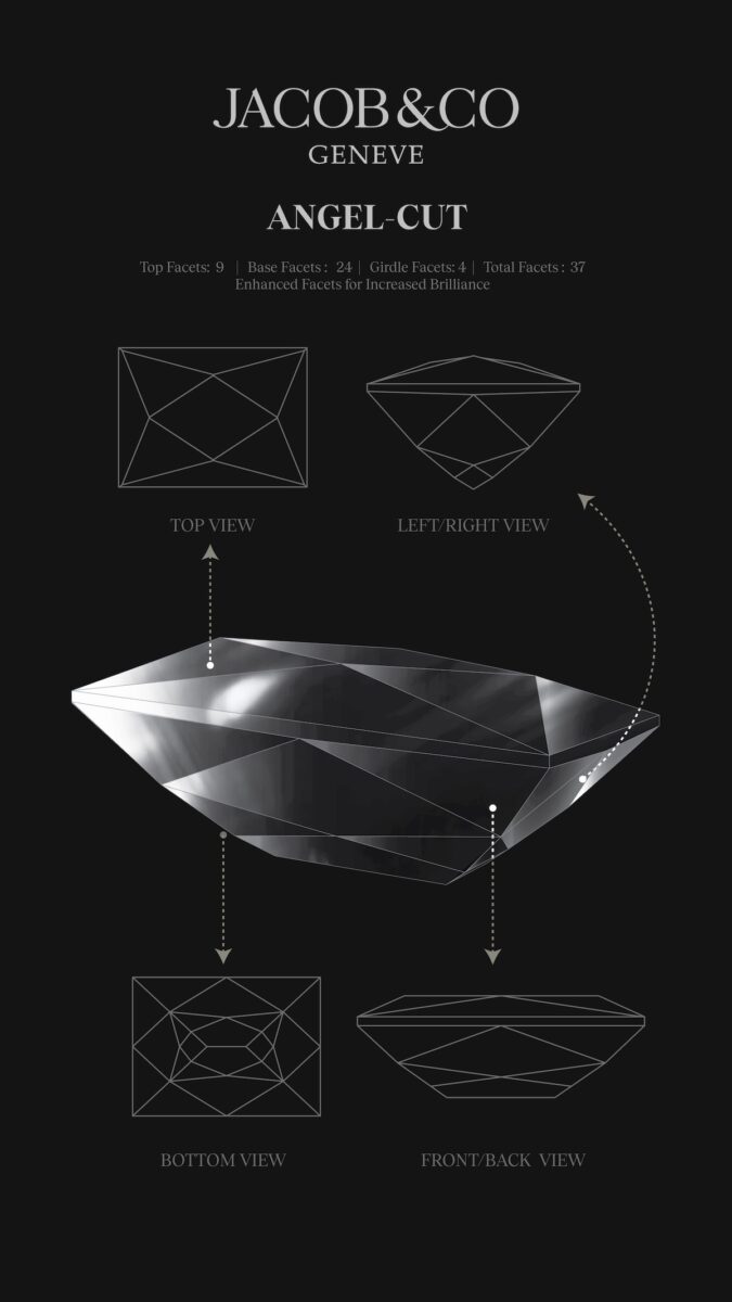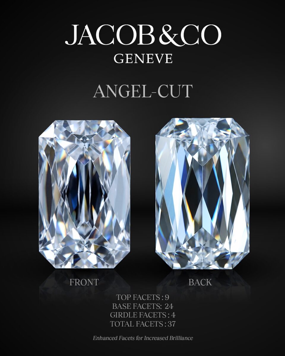 這項名為「Angel Cut」的工藝結晶,背後承載著一段動人的深情篇章,其命名源自創辦人夫人 Angela,致敬兩人攜手走過、激發無數靈感的永恆愛情。這份心意被精確地轉化為物理幾何,Angel Cut 擁有 37 個經由電腦嚴密計算的切面,恰好對應 Jacob 與 Angela 結縭 37 載的歲月,讓冰冷的鑽石從此有了溫度的靈魂。在技術核心上,這項車工成功化解了業界長久以來「光學火彩」與「原石出成率」的矛盾,透過獨特的菱形檯面設計與切角階梯矩形輪廓,徹底重塑光影在鑽石內部的行進路徑,呈現出立體且具層次感的視覺饗宴,即便在受限的鑲嵌空間內,依然能迸發出連續且飽滿的向上火光。