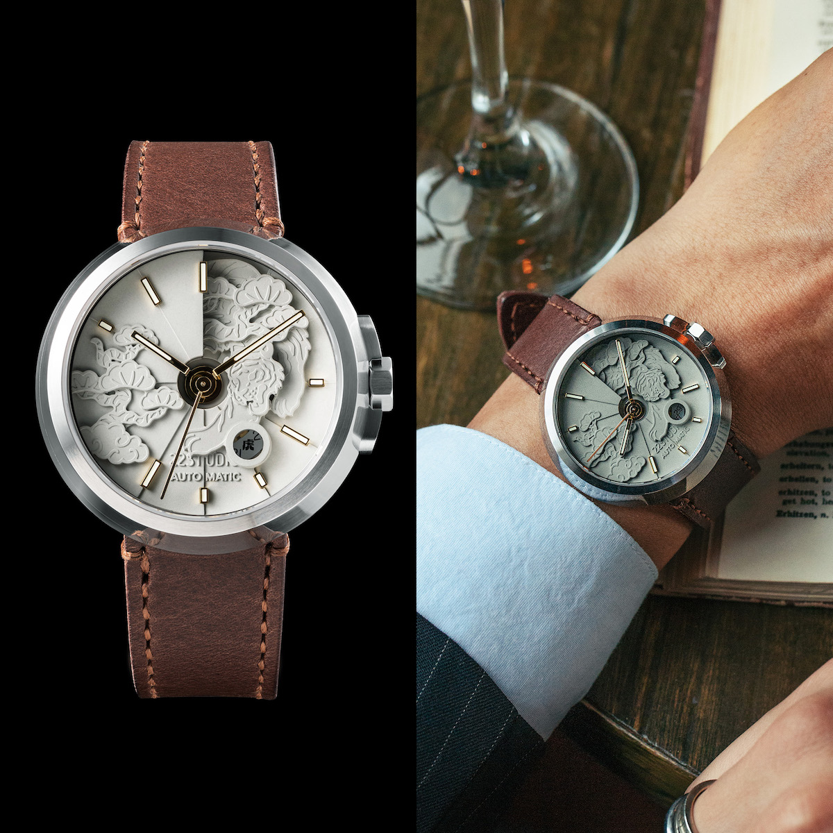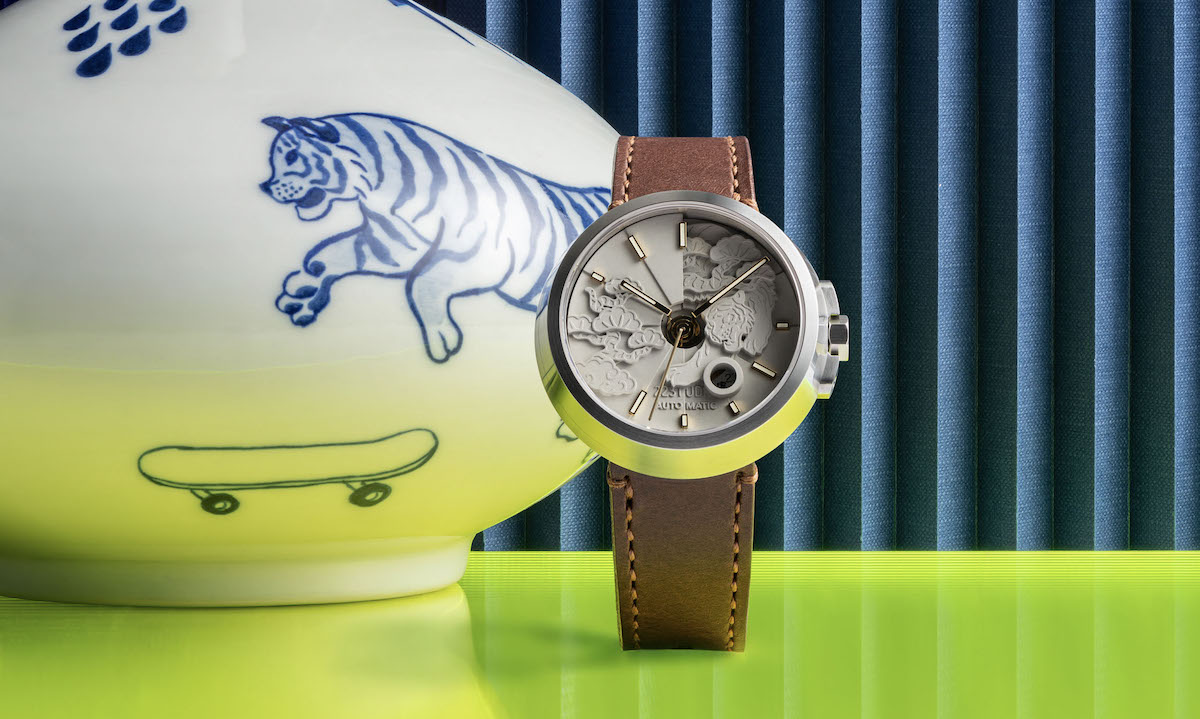 水泥工藝首次結合東方潮感,手錶面盤的老虎圖像出自台灣知名設計工作室「只是ZISHI」,巧妙地將傳統典雅的東方美學──水墨、瓷繪常見的「虎」與「松」,重新架構為立體形象,霸氣盤踞於四度空間的經典旋轉樓梯上。
