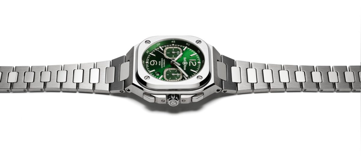 Bell & Ross這次的新作BR 05 Chrono Green Steel採用精鋼材質打造而成,並融合品牌經典方中見圓的外觀線條設計。此外,錶殼四邊皆以平面磨砂及倒角拋光處理,營造絕佳反光效果,呈現此系列想要表達的城市建築之美。而系列共有兩款,一款配有一體式鏈帶,另一款則是綠色膠帶。打造了新穎的「城市綠」意象,提供錶友全新的選擇,同時也為BR 05系列帶來運動款、都市時尚風格腕錶選擇的新生力軍。