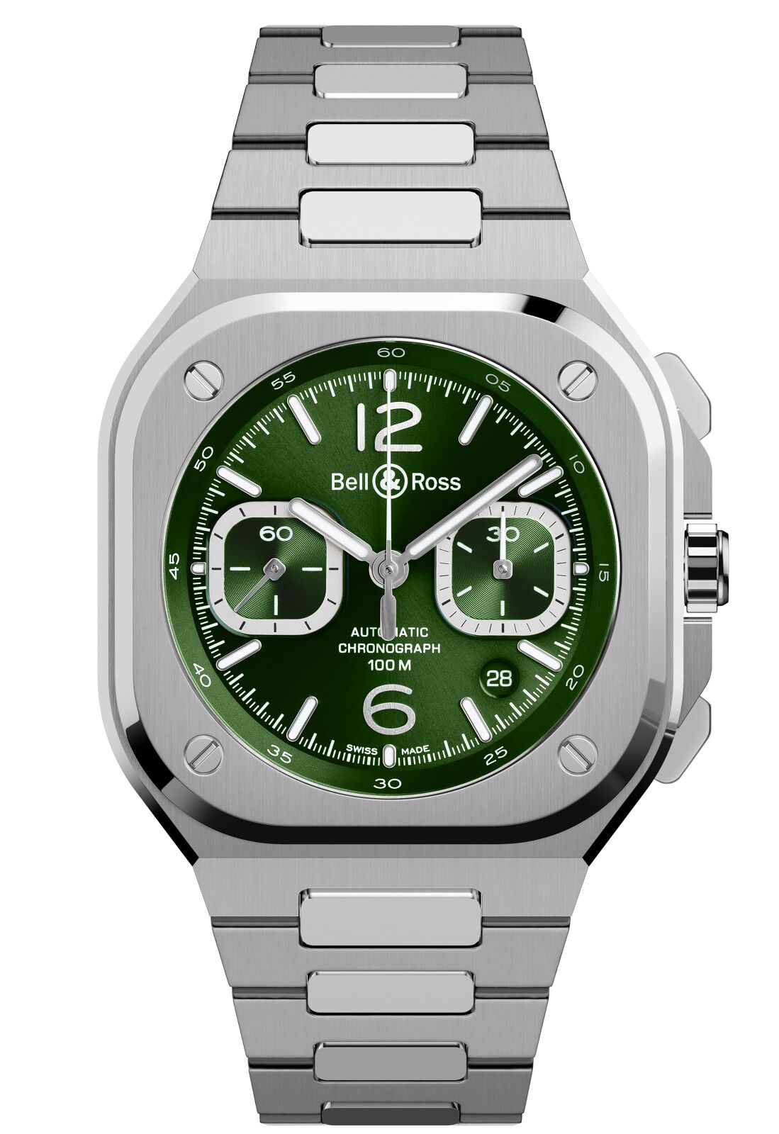 BR 05 CHRONO GREEN STEEL/錶徑:42mm/機芯:R-CAL.326自動上鍊機芯/動力儲存:56小時/防水深度:100m/建議售價: 218,000 NTD (鍊帶款) 202,000NTD(膠帶款)