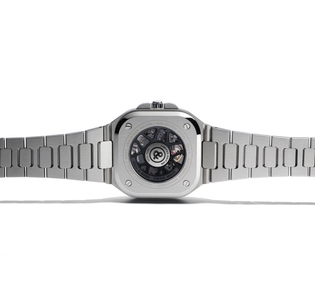 與錶殼一氣呵成的鏈帶更是BR05的特色。兼且薈萃Bell & Ross堅持的精確,易讀,可靠及實用四大原則,各項優點相輔相承叫人一望傾心。鏤空機芯是BR05 SKELETON的一大特色,精巧的結構一覽無遺。BR-CAL.322自動機芯裝配全黑色PVD塗層擺陀,從錶背可欣賞機芯造工,開面錶盤亦透視黑色PVD塗層機芯及鏤通夾板,簡潔俐落的結構佈局一目了然。