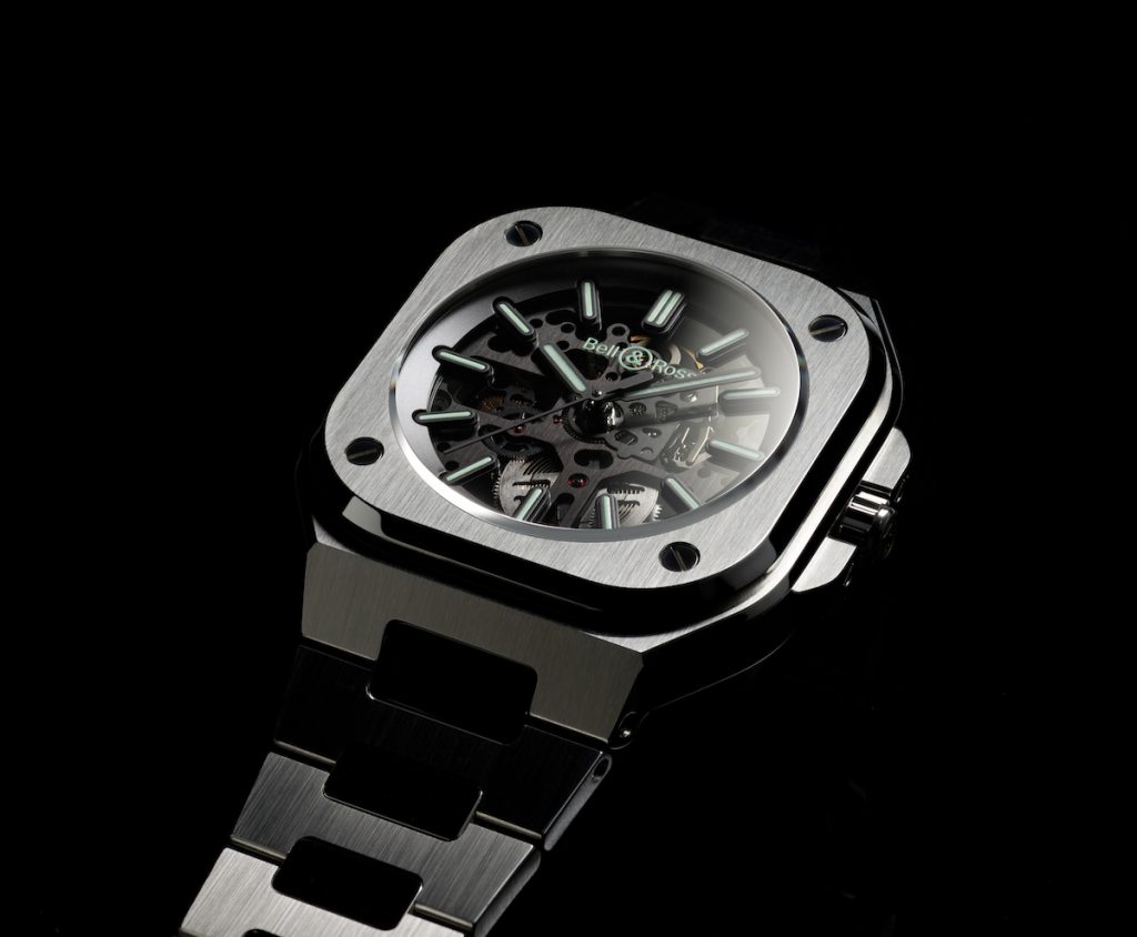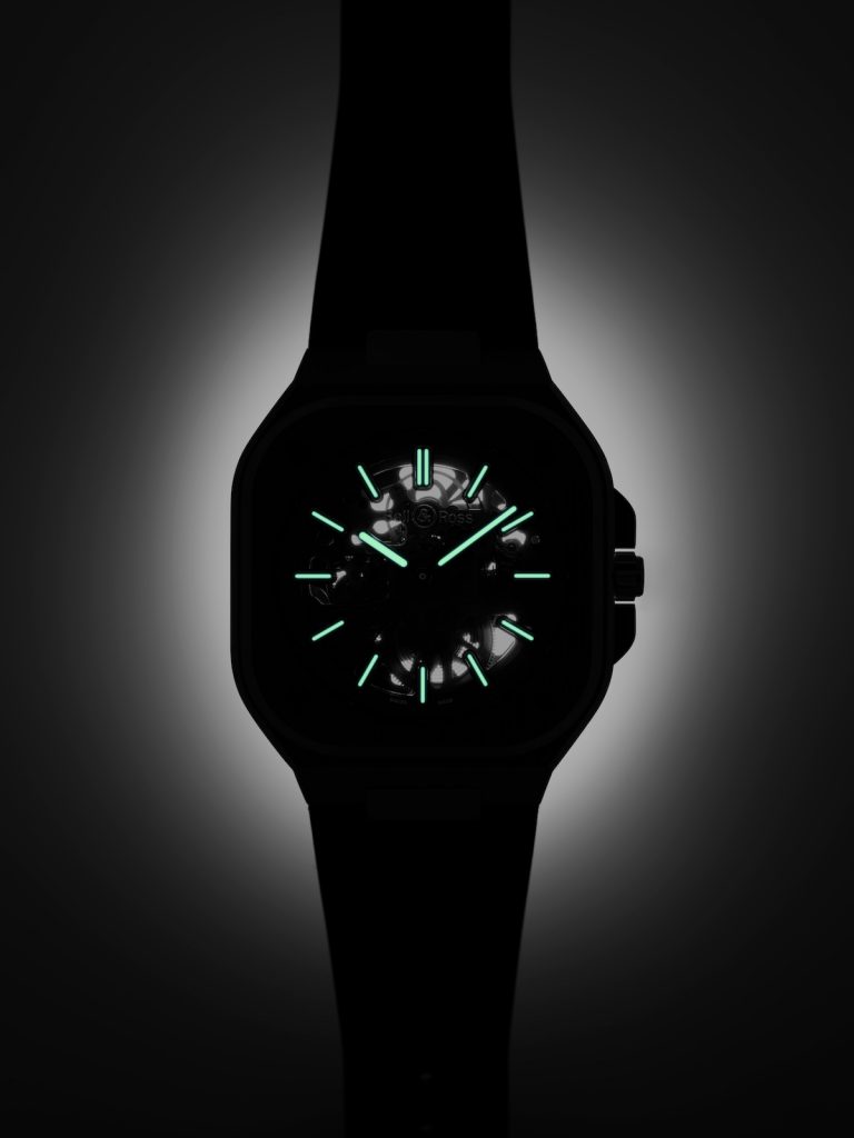 全新BR05 SKELETON NIGHTNUM鏤空夜光腕錶延續2019年灰色錶盤及2020年藍色錶盤的成功之道,其鏤空機芯以黑配綠,確保日夜環境皆無損清晰顯示,由此衍生出來的LUM夜光腕錶亦成為品牌代表作。