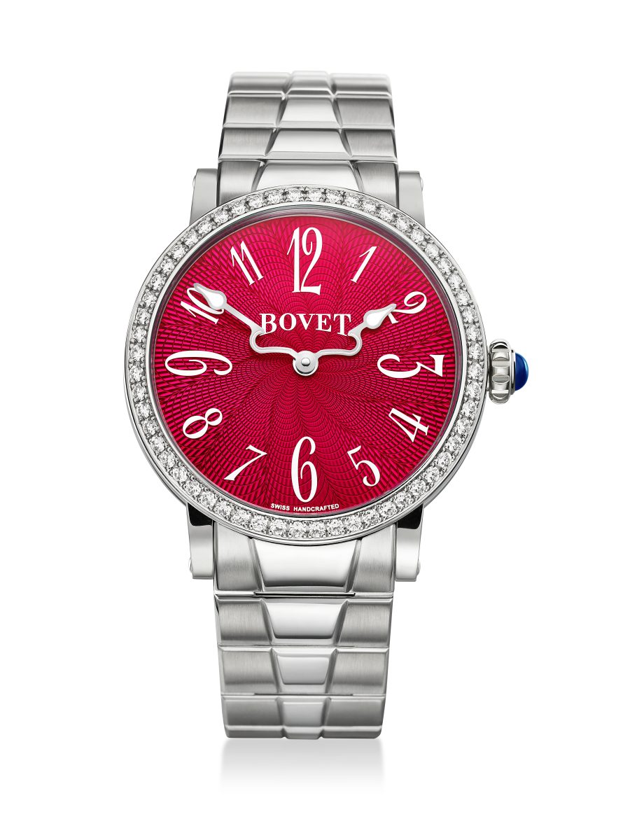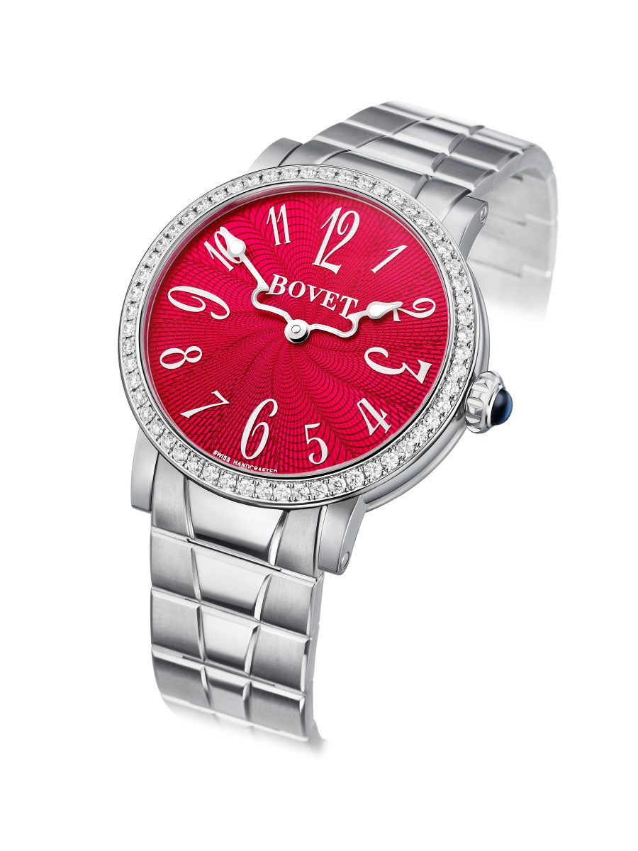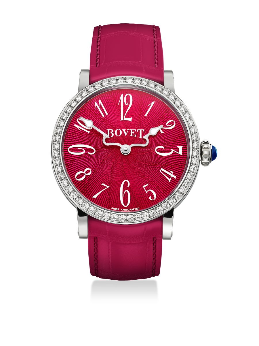Ré cital 12 36 毫米腕錶提供綠松石色或覆盆子紅色漆面機刻雕花錶盤,亦可選擇珍珠母貝錶盤。鮮明的色調展現佩戴者既堅定又優雅的個性,並象徵 BOVET 超過 200 年的卓越工藝傳承。錶盤上的「蓮花」機刻雕花圖案致敬品牌悠久歷史,12 片花瓣象徵著白天與夜晚的 12 個小時,寓意著每一刻皆由您掌控。時分針的設計則呈現出 BOVET 獨特的詩意魅力,每當時針與分針交會,指針末端便會形成浪漫的心形,這不僅是對美好生活的詩意表達,更提醒佩戴者以積極浪漫的心態迎接每一天。Ré cital 12 36 毫米腕錶搭載高級製錶自動機芯 11BA15,專為喜愛精緻尺寸且同樣重視 BOVET 卓越工藝與細節的藏家打造。
