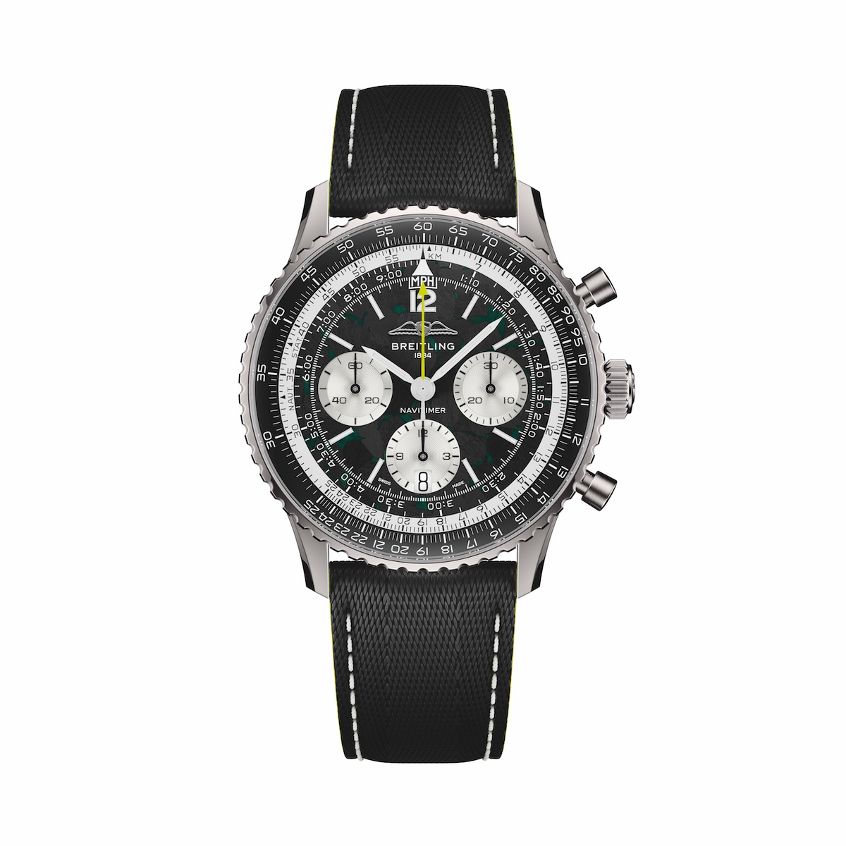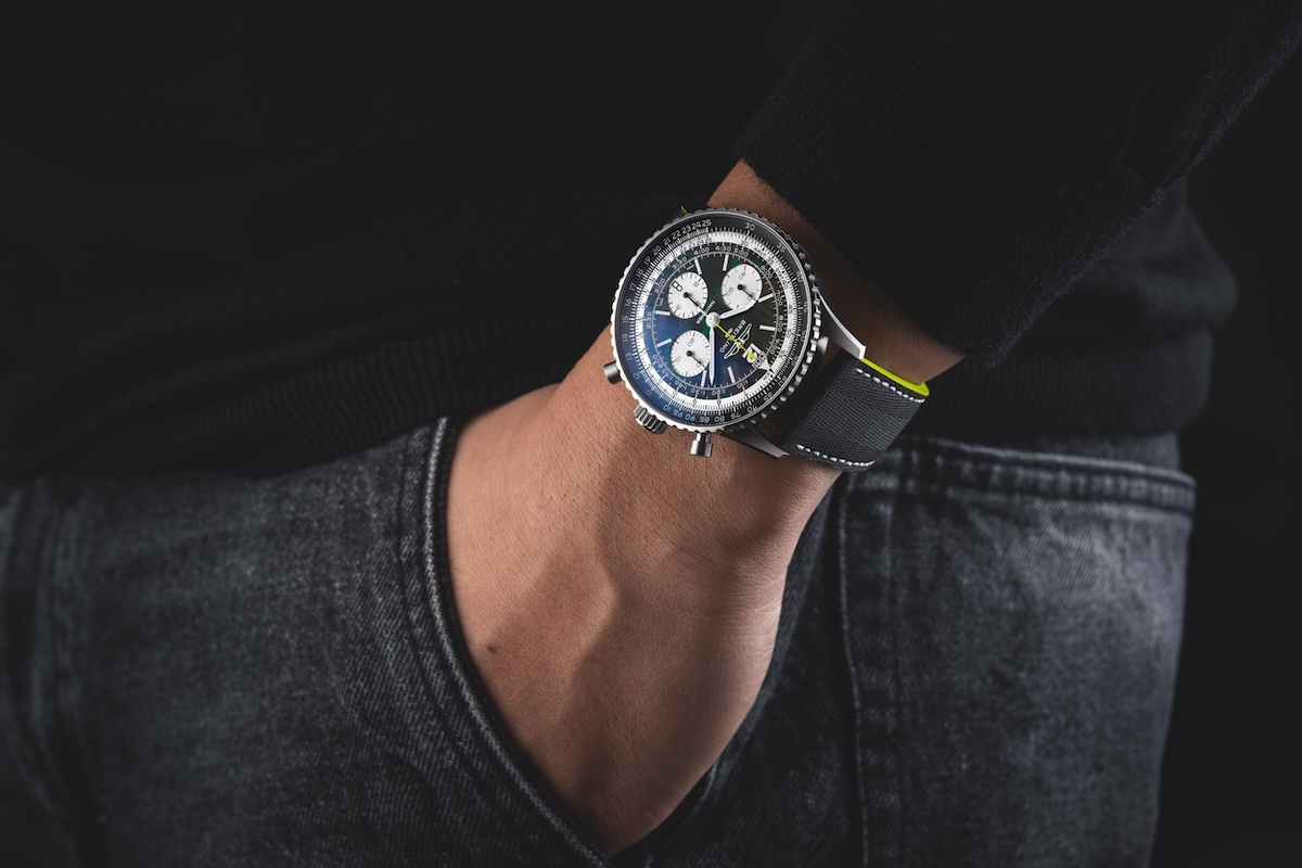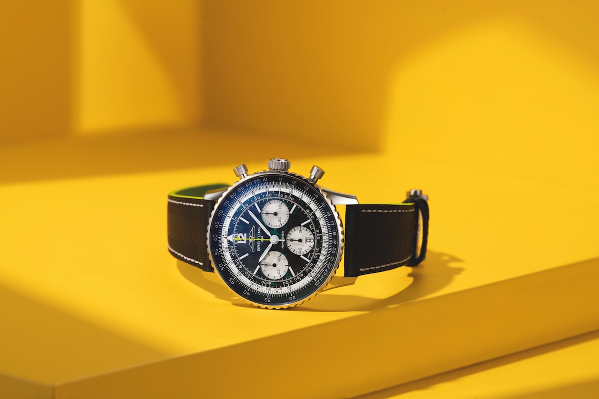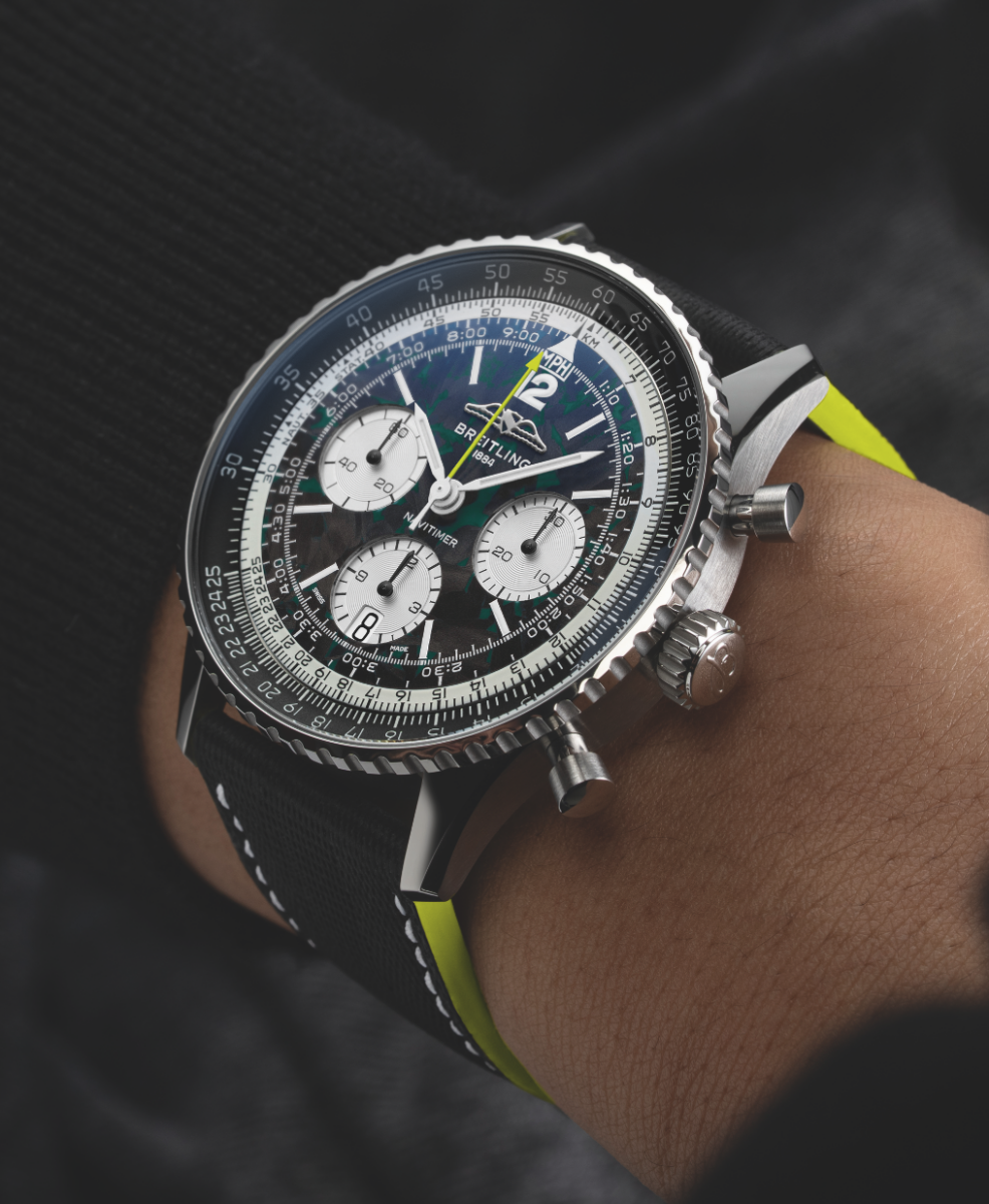 設計細節更是讓內行人一眼辨識:經典的賽車綠錶盤搭配醒目的清檸色調,視覺張力拉滿;更突破性地在 Navitimer 系列中首度採用鈦金屬錶殼與碳纖維材質,輕盈且堅固,彷彿將賽車駕駛艙的尖端科技直接移植到佩戴者的腕間。