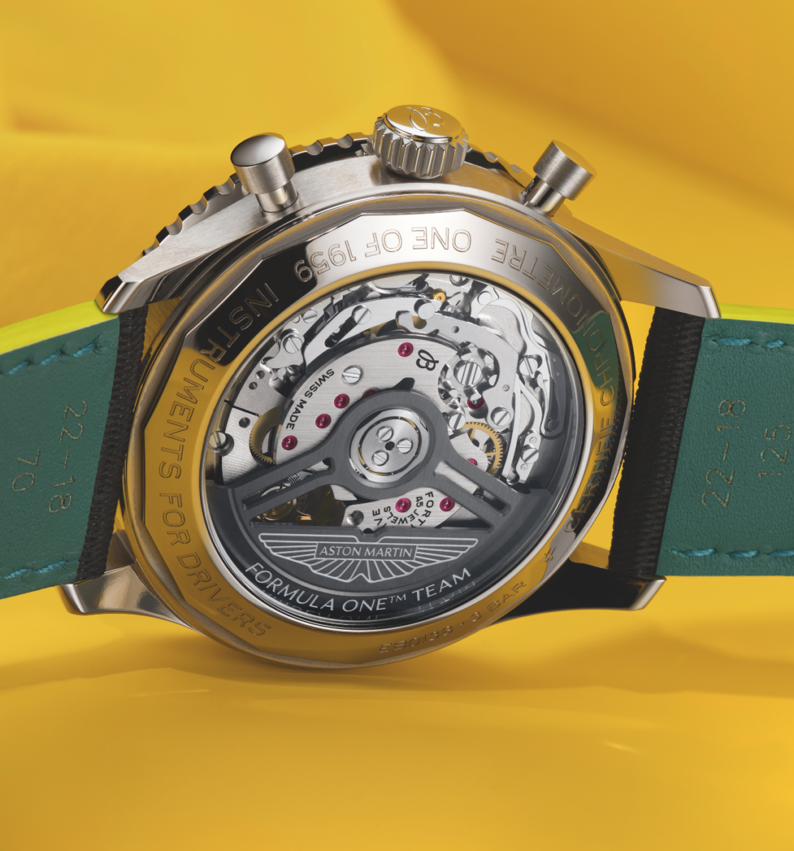 為了慶祝這段傳奇關係的延續,首款聯名巨作 Navitimer B01 Chronograph 43 Aston Martin Aramco Formula One™ Team 限量腕錶正式問世。限量 1,959 枚的數字,正是為了致敬 Aston Martin 於 1959 年首度踏上 F1 舞台的光輝歷史。