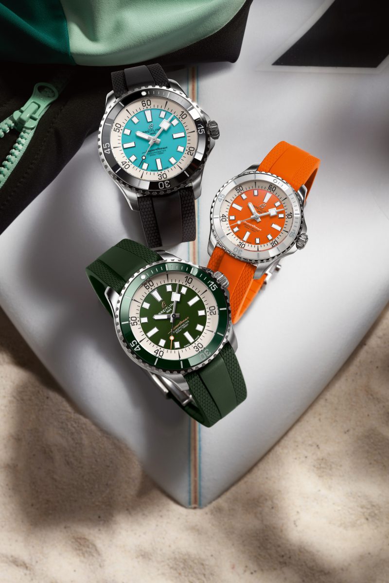 由凱利·斯雷特(Kelly Slater)、史蒂芬妮·吉爾莫(Stephanie Gilmore)和薩利·菲茨邦斯 (Sally Fitzgibbons)組成的百年靈衝浪行動隊,重返全新Superocean超級海洋系列擔任形象代言人。該系列包括限量版凱利·斯雷特(Kelly Slater)超級海洋自動腕錶42 (Superocean Automatic 42)。這款限量版腕錶與衝浪冠軍共同設計,配有令人驚艷的橘色錶盤和軍綠色橡膠錶帶,且限量1,000隻。配色方案的靈感來自斯雷特(Slater) 的父親在衝浪時佩戴的腕錶。