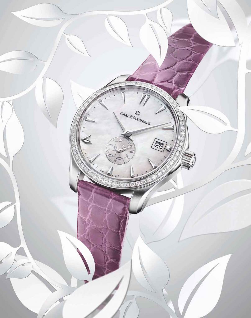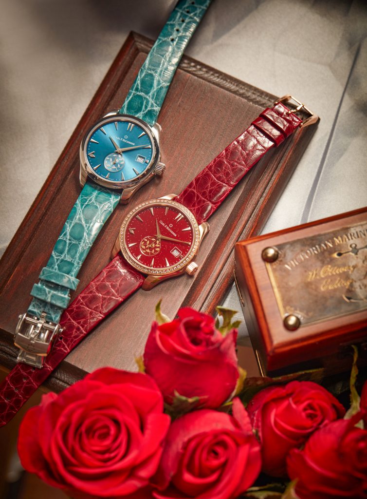 玫瑰金型號的錶圈鑲嵌62顆閃爍美鑽(0.65克拉)與色彩鮮明的紅色錶盤相得益彰,也寓意著母子間親情至臻的天倫之景。藍綠色型號氣質優雅雋永, 寓意愛與關懷,面盤六點鐘位置,小秒盤透過漆藝的華麗表態母子之間的情感連結,如同枝葉相連般生生不息; 顏色濃厚的錶盤在不同光線下折射出耀目光芒, 搭配同色系鱷魚皮錶帶,倍顯寶齊萊馬利龍AutoDate LOVE系列的獨家魅力。