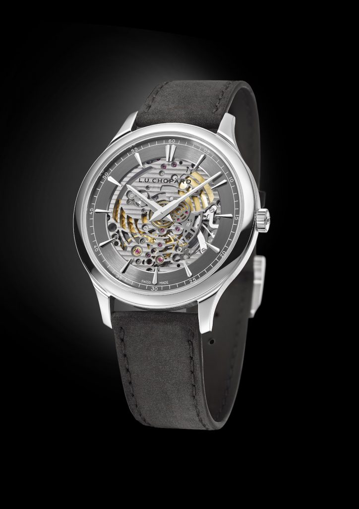 L.U.C XP Skeletec錶款亦不例外。直徑40毫米的錶殼以符合倫理道德標準的18K白金打造,其纖長錶耳設計令腕錶更貼合手腕,而經絨面磨砂處理的小牛皮錶帶則配以同色調灰色縫線,為單色設計更添低調內斂的氣質。