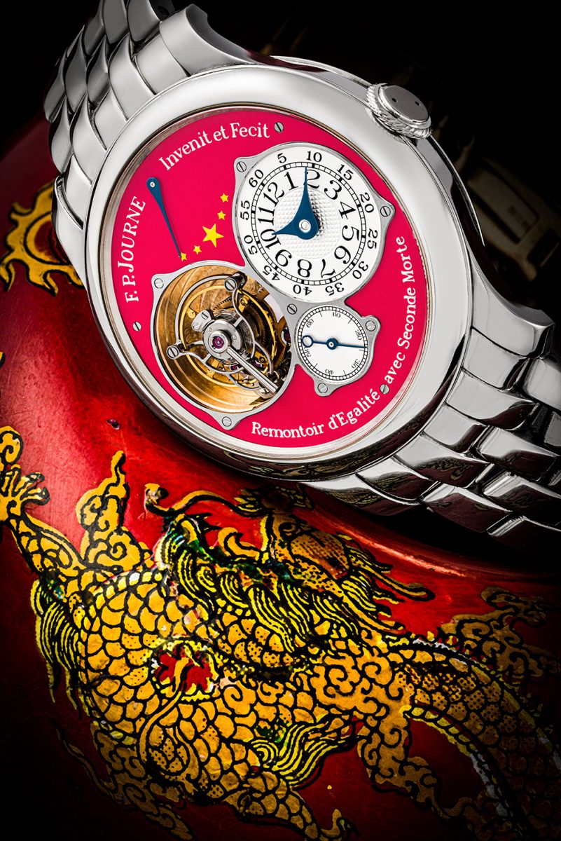 這枚F.P. Journe 2010年中國限量版陀飛輪鏈帶腕錶,以鉑金錶殼與紅色漆面錶盤的絢麗組合而著稱,限量生產僅5枚,市場上極為稀有。除了令人驚艷的陀飛輪外,此枚2010年中國版腕錶配備獨立跳秒功能,及恆動力裝置以確保精準度;約2010年製。 (估價:港元6,500,000-12,000,000)