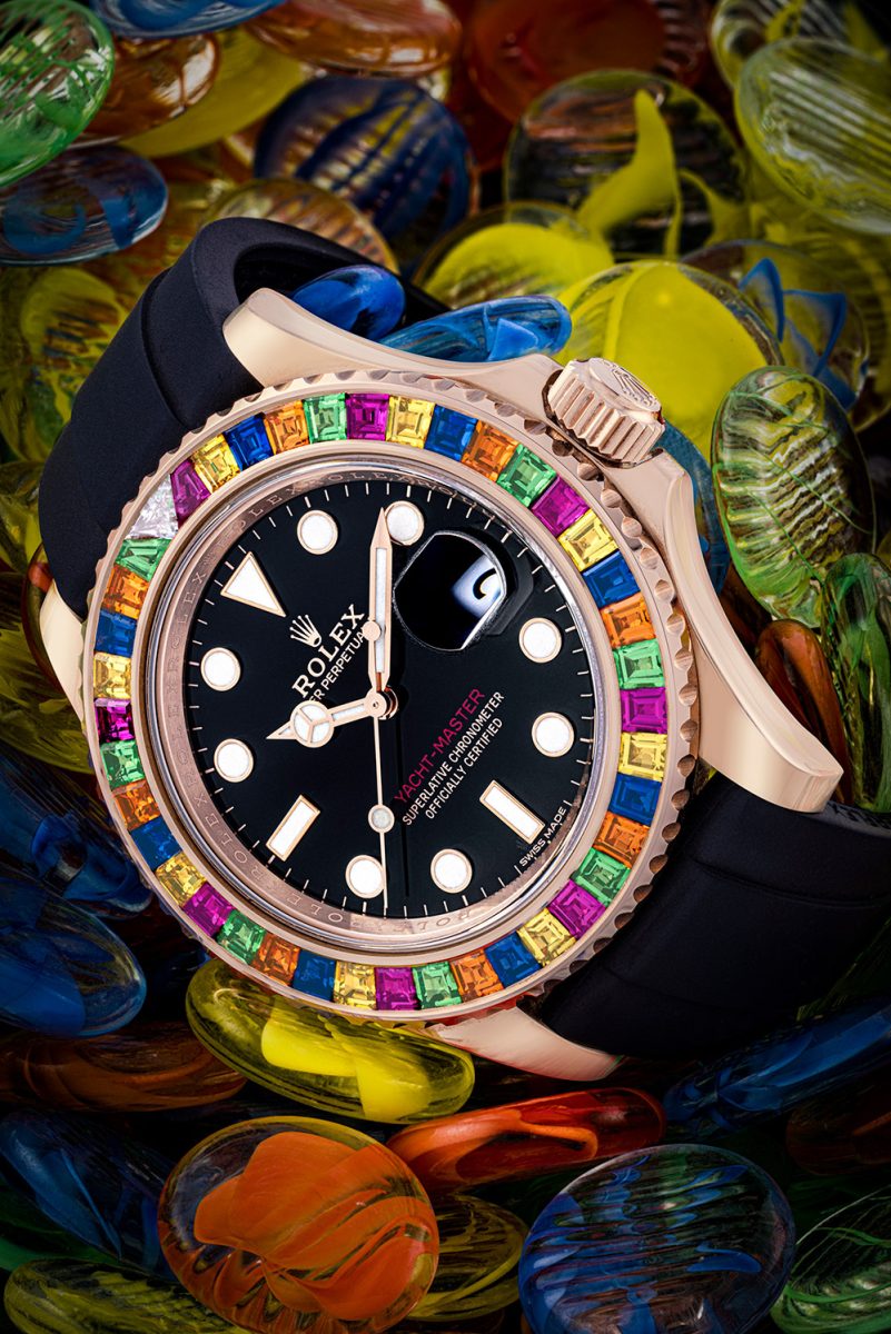 這枚璀璨繽紛的18k粉紅金勞力士Yacht-Master “Candy” Ref.116695SATS腕錶,鑲有鑽石和彩色寶石。錶盤設有中心秒針及日曆顯示,約2019年製。 (估價:港元650,000-1,300,000)