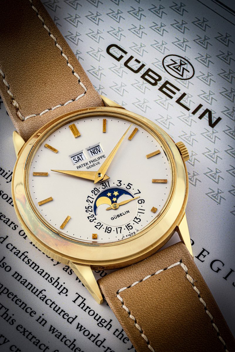 百達翡麗Ref.3448 18K金自動上鍊萬年曆腕錶,配月相顯示,由GÜBELIN銷售,配後補證書,1977年製。Ref.3448於1962年推出,是全球第一款量產自動機械萬年曆腕錶,直至1978年,它仍是市場上唯一一款自動機械萬年曆腕錶,故此拍品於市場上極為稀有。(估價:港元1,200,000-2,400,000)