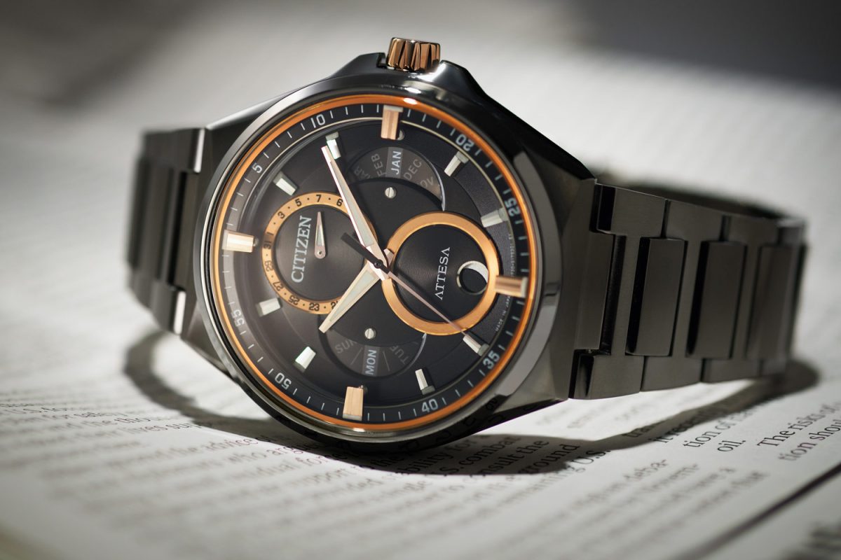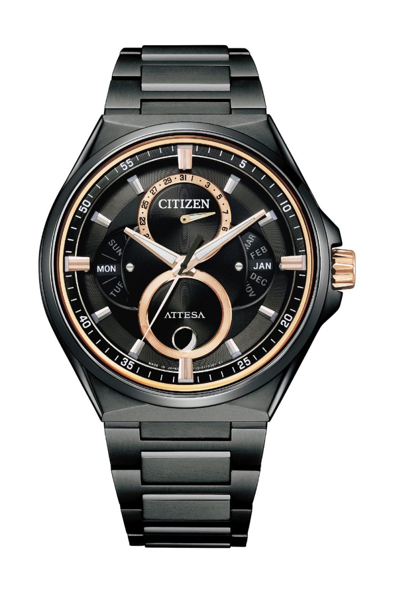 想創造腕錶的層次感,從錶殼、錶圈與鍊帶著手最直觀,像是CITIZEN推出三款光動能月相腕錶,便打造結合多道切角,並以拉絲與磨光處理的錶殼與鍊帶。另一方面,日期、星期、月份與月相等功能,呈現於部分重疊的副錶盤上,產生獨特的層次感。三款腕錶共有鈦金屬錶殼搭配小牛皮錶帶、鈦金屬錶殼結合鍊帶,以及用黑色和粉紅金DLC鈦金屬處理的雙色調款式,搭配同色系鍊帶,創造出屬於CITIZEN的日式強悍運動風。