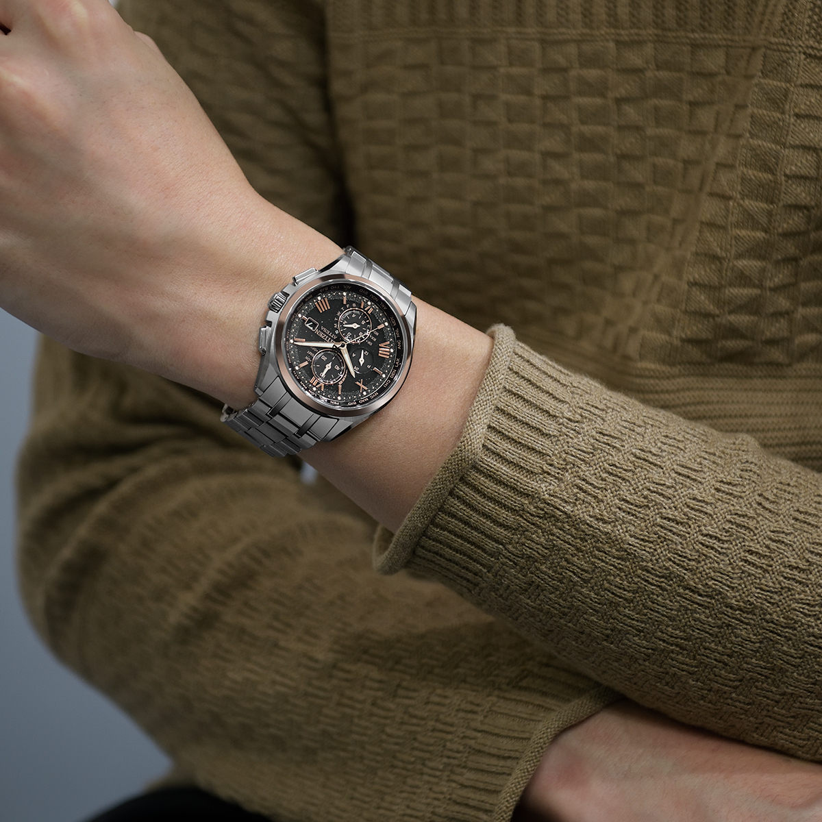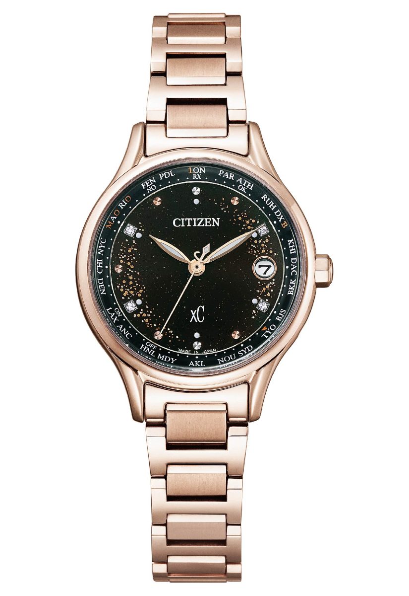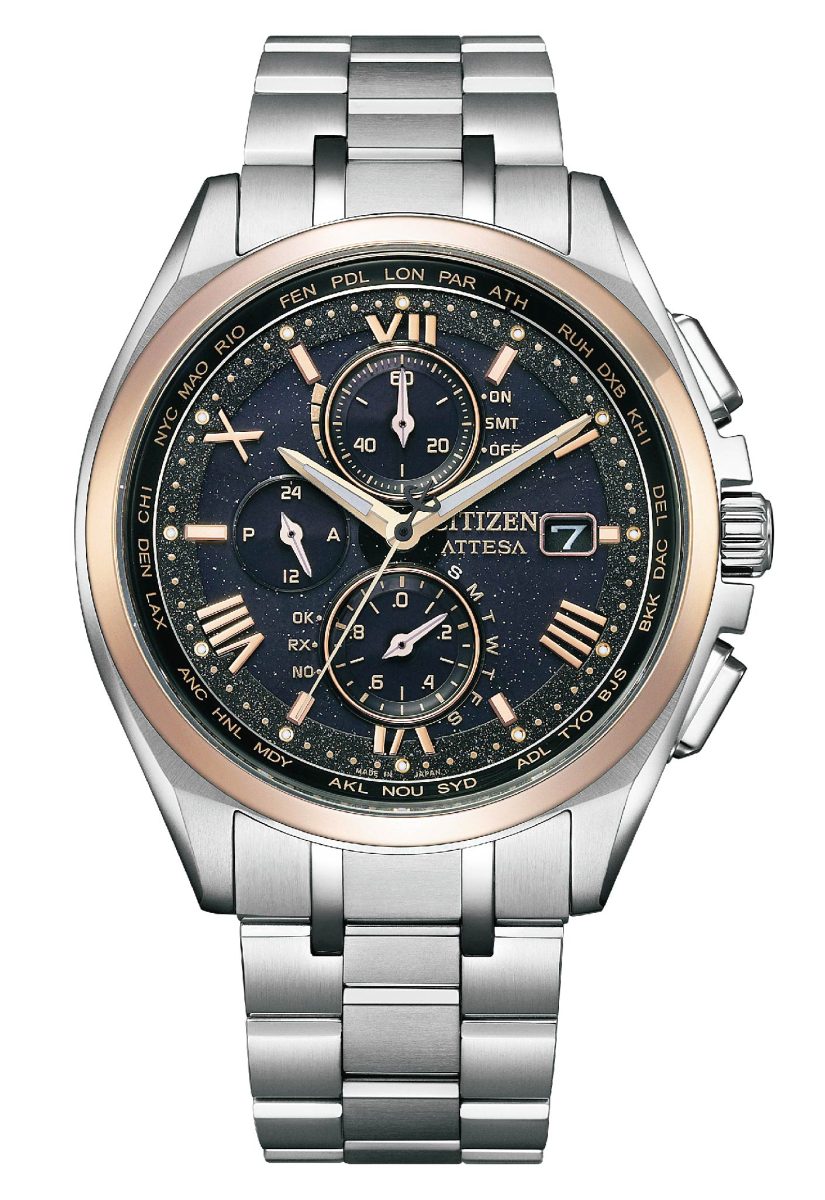 CITIZEN電波時計30週年限定款腕錶其中的兩款男錶以及一款女錶,皆搭載光動能全球多局電波對時機芯,第一款AT8254-61E以一抹CITIZEN獨家的Sakura pink櫻花粉紅金的色澤渲染了錶圈,同色的時標與指針與漆黑的面盤呈現鮮明對比,恰如曙光溫厚的力量,其搭載了H800光動能多局電波機芯,以及選用超級鈦材等CITIZEN看家本領,鍊帶和錶殼一脈相連達到輕盈順手的配戴感。