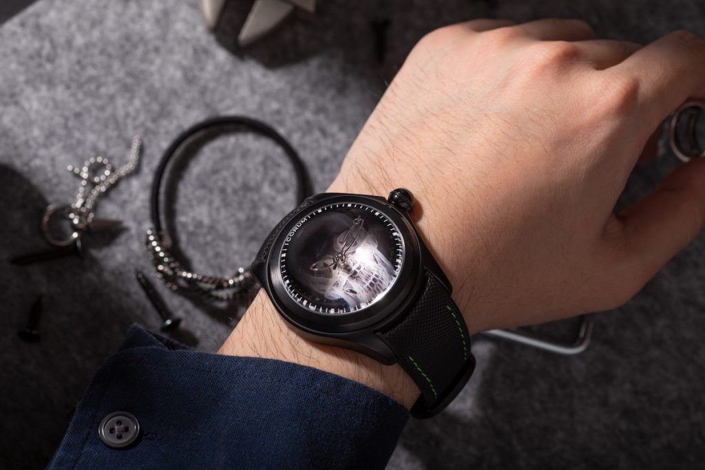 全新泡泡Bubble X Ray腕錶,向舊有的骷髏頭錶款致敬。充滿個性而擬真度高的骷髏頭圖案,設置在錶盤的中央,巨型的圓拱形水晶玻璃錶鏡,將骷髏頭圖案放大,加强視覺享受;由於其强勁的夜光效果,即使在黑暗的環境中,骷髏頭圖案也可以完全清晰地呈現,就像X光一樣。當燈光熄滅的時候,骷髏頭會發出詭秘的熒光綠色,視覺效果相當刺激。爲配合錶盤設計,腕錶的複合式材質錶帶也用上熒光綠色縫綫,效果一氣呵成。