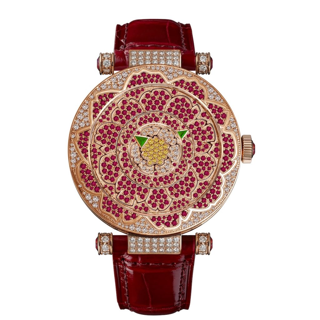 Double Mystery牡丹系列中央轉盤的箭頭,可讀取小時,而分針盤設在時針盤之外,同樣以箭頭形式進行讀取。這個顛覆傳統的錶盤設計,早在1998年就已獲得專利。腕錶鑲嵌數量繁多、色彩絢麗的鑽石和半寶石,均由工匠全手工製作而成。錶盤共鑲嵌662顆鑽石和寶石,總重4.87克拉,精緻勾勒出牡丹美態,寶石花瓣從錶盤延續至錶殼,更添整體美感。