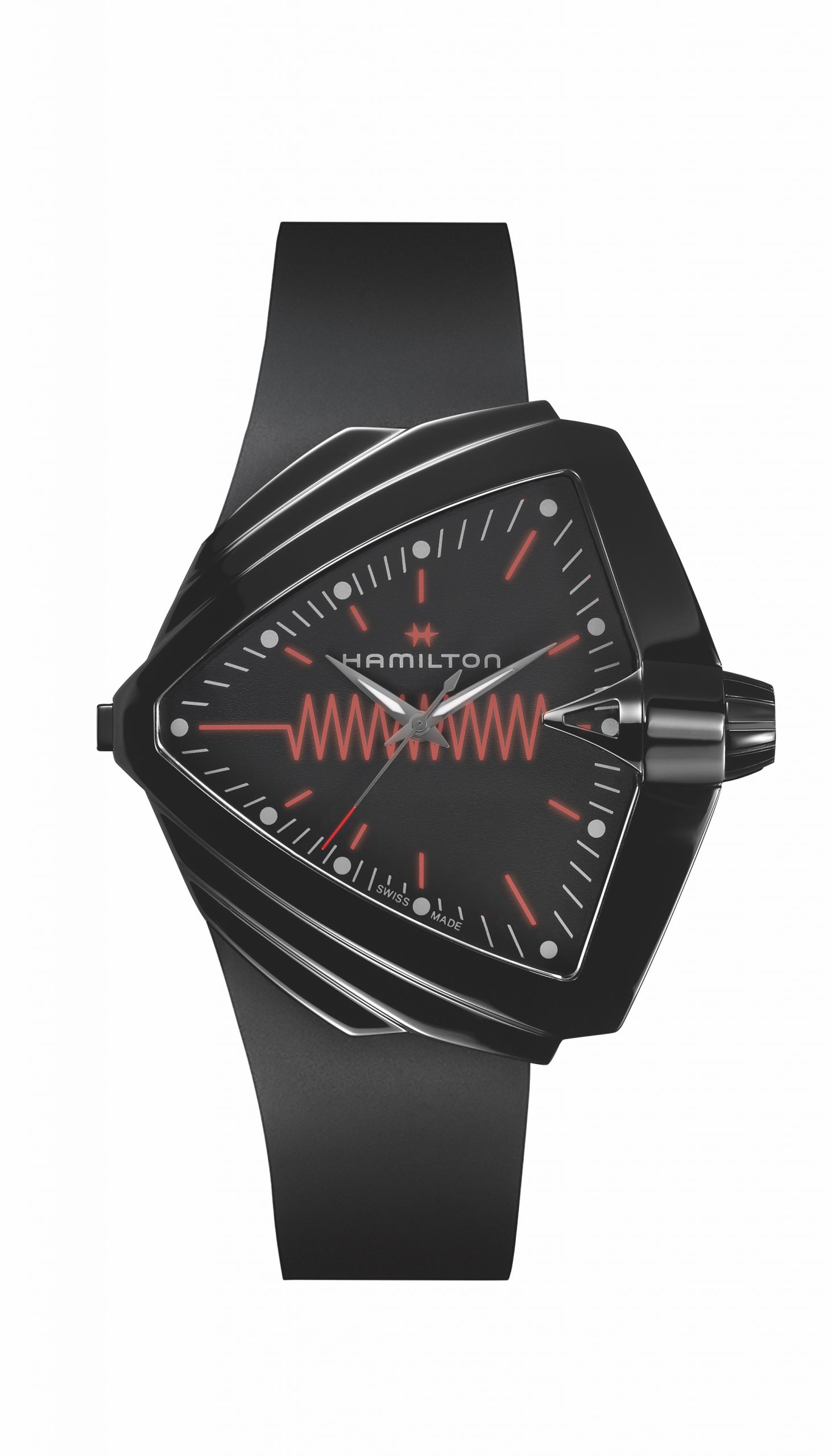如今,漢米爾頓以全新低調款式——探險系列XXL腕錶亮色版——向此經典之作致意。這款腕錶配備47.6毫米精鋼錶殼,覆以光滑的黑色PVD塗層,並搭載特殊的石英機芯,按下位於9點鐘的按鈕就能照亮紅色的錶盤。帶有Super-LumiNova®夜光塗層的黑色時針和分針與電波圖案和同款刻度相結合,對1950年代的款式進行了大膽嘗試,其外觀讓人聯想到夜晚的城市霓虹燈牌,令人興奮不已。探險系列XXL腕錶亮色版搭配舒適的黑色橡膠錶帶,並配備雙層防反光藍寶石玻璃錶鏡,所用材質及設計風格均十分鮮明:漢米爾頓仍是腕錶設計先鋒,不斷挑戰極限。