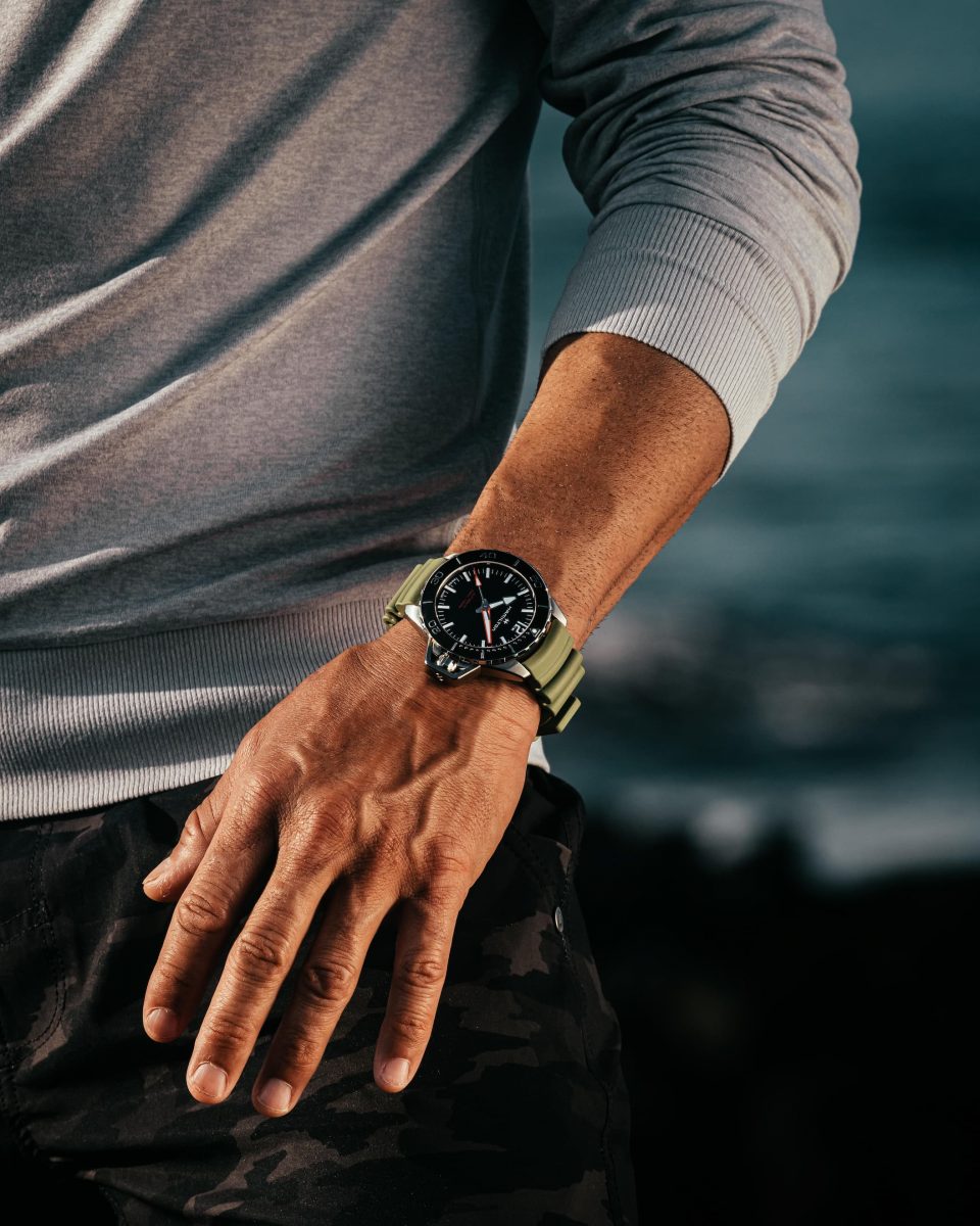 漢米爾頓卡其海軍系列Frogman自動上鍊腕錶是一款擁有輝煌歷史的現代探險腕錶,在深海中亦遊刃有餘,時刻確保精準性能。系列腕錶以勇敢無畏的美國海軍「蛙人」(Frogman)特種部隊命名,首批腕錶在二戰期間陪伴這些精英士兵們英勇作戰。最新作品延續這種果敢精神,結合當代設計和先進技術,繼續探索未知之境。