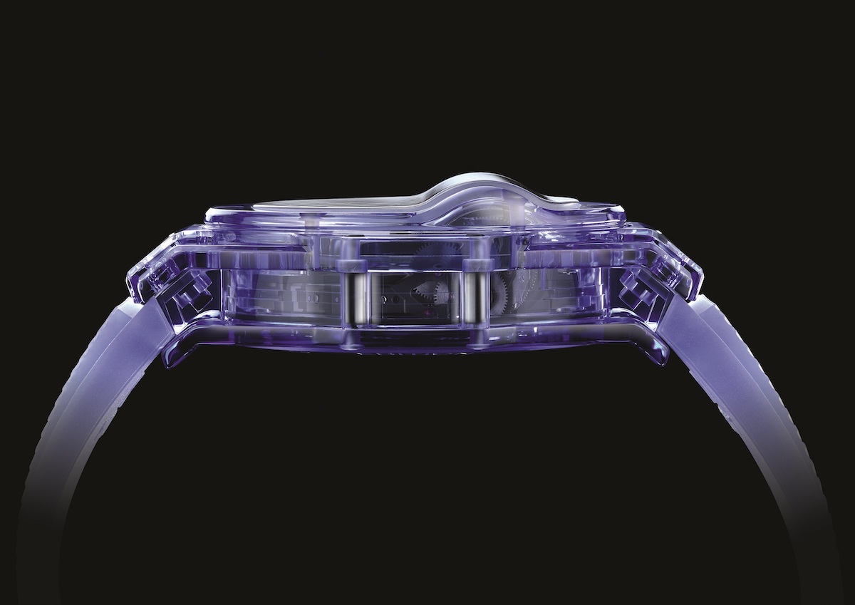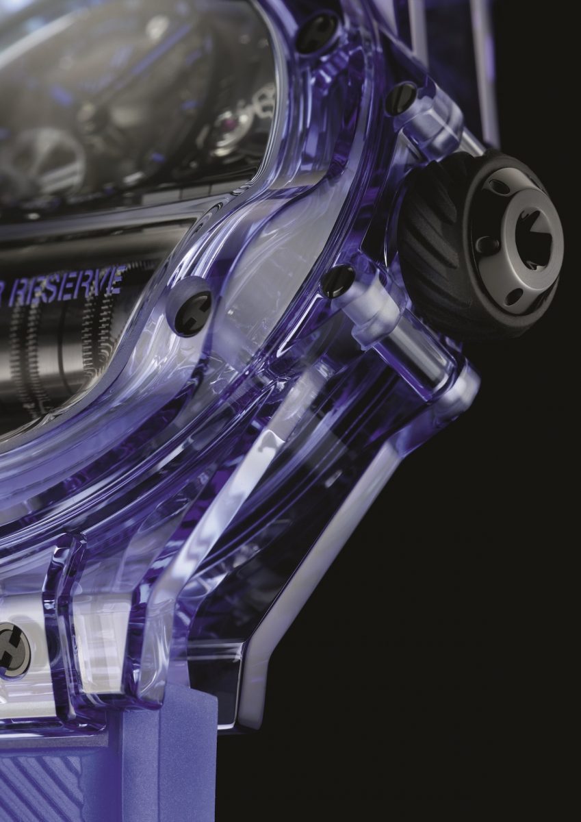 藍色藍寶石錶殼的弧型線條,清楚展現汽缸造型的複雜機芯,同時也放大動力儲能顯示效果。堅硬的藍寶石透過複雜高難度的製作過程,也因而提升腕錶本身的價值。全景透視可清楚呈現每個細節。宇舶透過專業知識和成熟的製錶流程,持續打造各款色彩豐富且新穎的藍寶石材質,包括透明、黑色、藍色、紅色、黃色以及橙色款。藍寶石硬度極高,因此需要特定方式進行加工。 而錶殼中央輪廓與錶圈則需要與圓柱形發條盒匹配,這無疑是新款腕錶打造過程中的又一項挑戰。 藍色結構化帶襯裡橡膠錶帶與藍寶石錶殼的別致色彩相得益彰。 45毫米霸氣錶殼、開放式機芯設計、源自超跑引擎的機械結構、覆蓋碳灰色鍍釕處理的時尚色系,錶冠與藍色橡膠錶帶的設計,呼應螺旋式齒輪機構,每一處細節皆能被嚴格檢視。