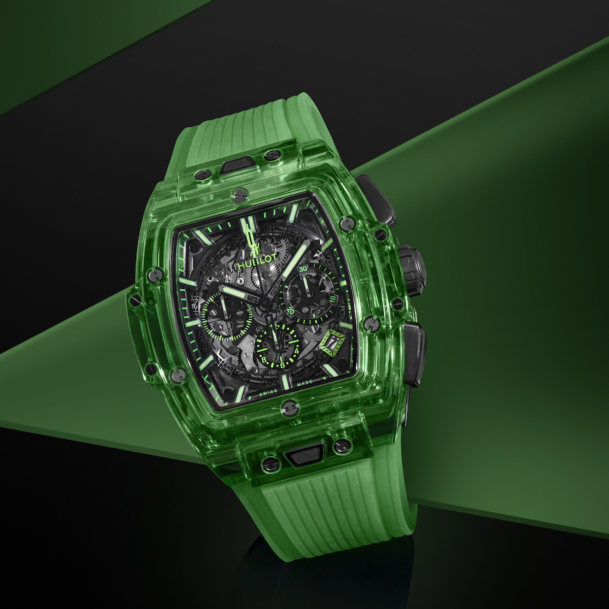 除了全新到貨的Big Bang MP-11藍色藍寶石水晶腕錶,此次也同時展出透著碧綠的Spirit of Big Bang SAXEM計時碼錶,呈現品牌在藍寶石錶殼的領先姿態。