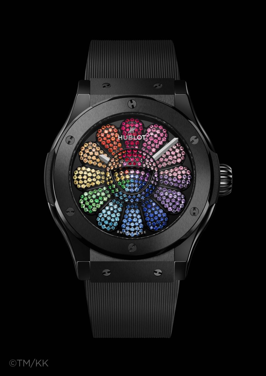 花瓣的動感效果與 45 毫米黑色陶瓷錶殼形成鮮明對比。限量聯名錶款完全在宇舶瑞士尼翁錶廠打造,採用經典融合系列的標誌性錶殼,搭載宇舶自製Unico機芯,可提供72小時動力儲存,以卓越性能結合潮流藝術大師村上隆的著名圖騰,更增添其收藏價值。