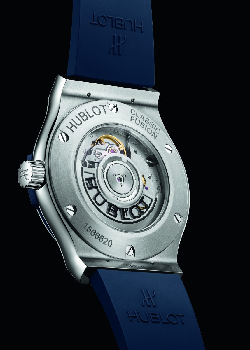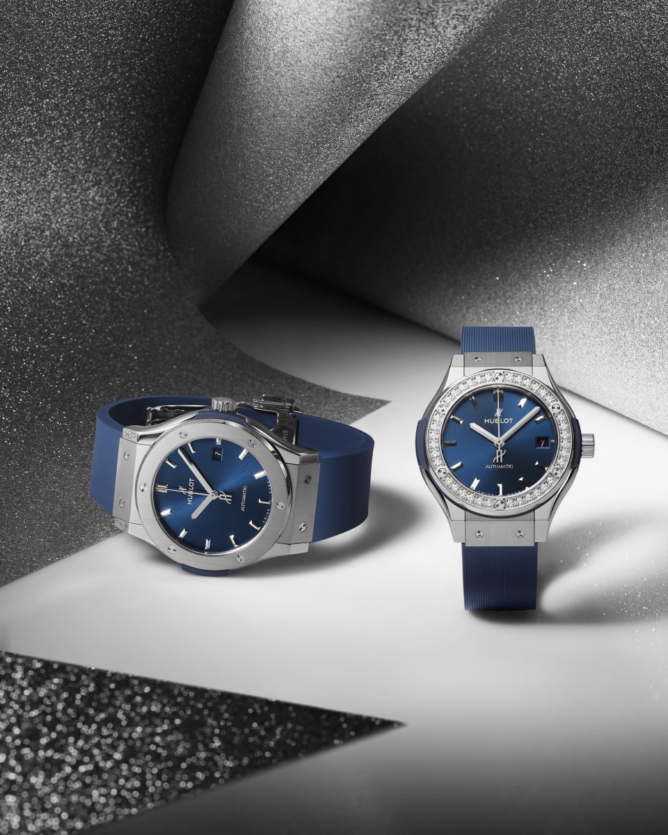 經典融合系列鈦金藍腕錶搭配鈦金屬錶殼與錶圈,以及品牌經典的藍色系橡膠錶帶,兩種截然不同材質呼應宇舶「融合的藝術」製錶理念。呼應採用髮絲紋打磨與拋光切面的錶殼與錶圈,面盤相對採用金屬刻度,以及帶有「H」的指針點綴。