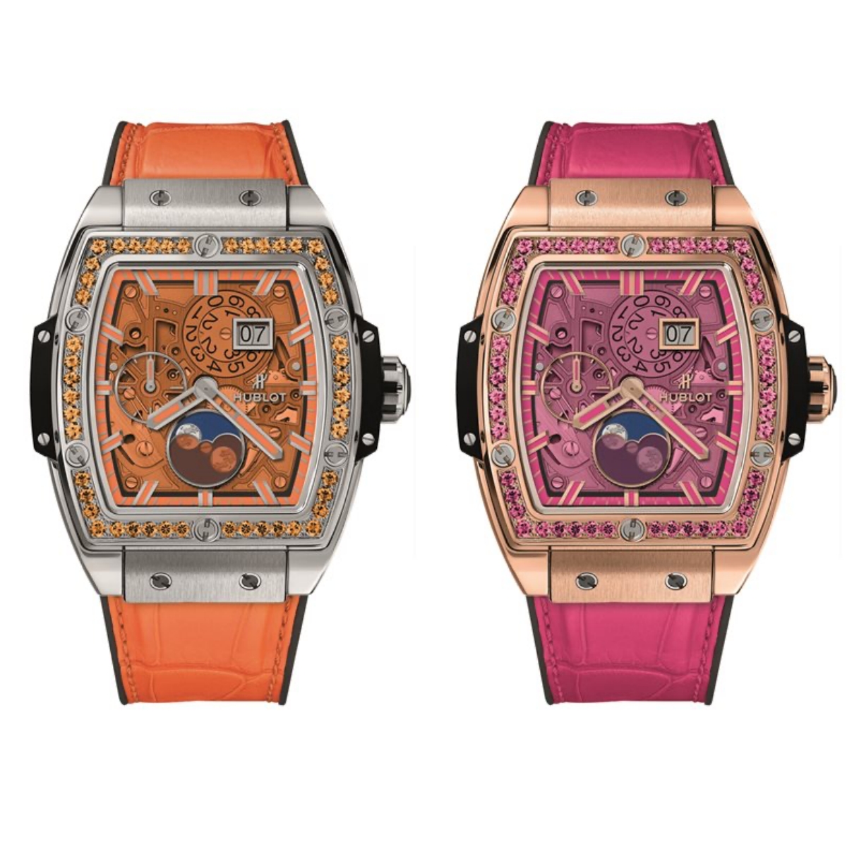 Spirit of Big Bang 月相彩色寶石腕錶直徑42mm,經典酒桶型錶殼為緞面處理的鈦金屬或皇金,以彩色藍寶石水晶鏡面映襯空機芯的精緻結構。錶圈分別鑲嵌48顆藍色藍寶石、橙色藍寶、粉紅藍寶石及紫水晶。錶帶以同色系鱷魚皮縫內襯天然橡膠錶帶,防水100米,動力儲存達50小時。