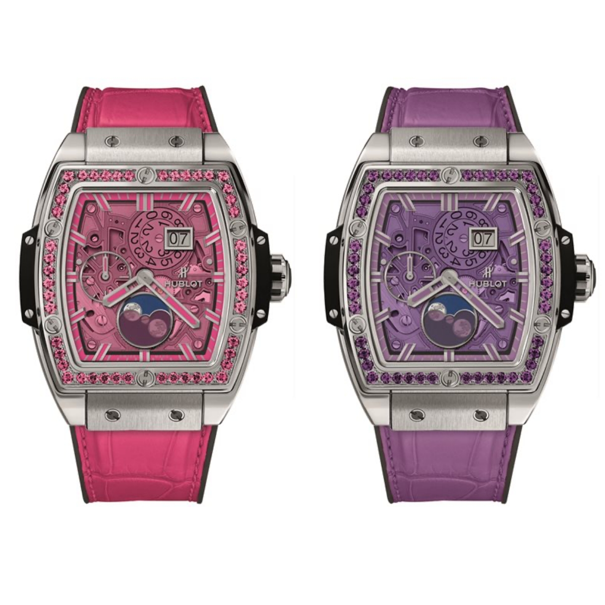 中秋夜派對一定要光燦奪目!熱愛繽紛色彩的瑞士製錶專家Hublo宇舶錶為明亮月光注入當季最潮的四種繽紛色系,呈現藍色、紫色、橙色與粉紅色的Spirit of Big Bang月相彩色寶石腕錶系列,從石英結晶面盤、噴砂月相顯示盤、指針、時標到寶石鑲嵌錶圈,全部搭配同一色調,創造出明艷動人的夢幻霓彩時計。
