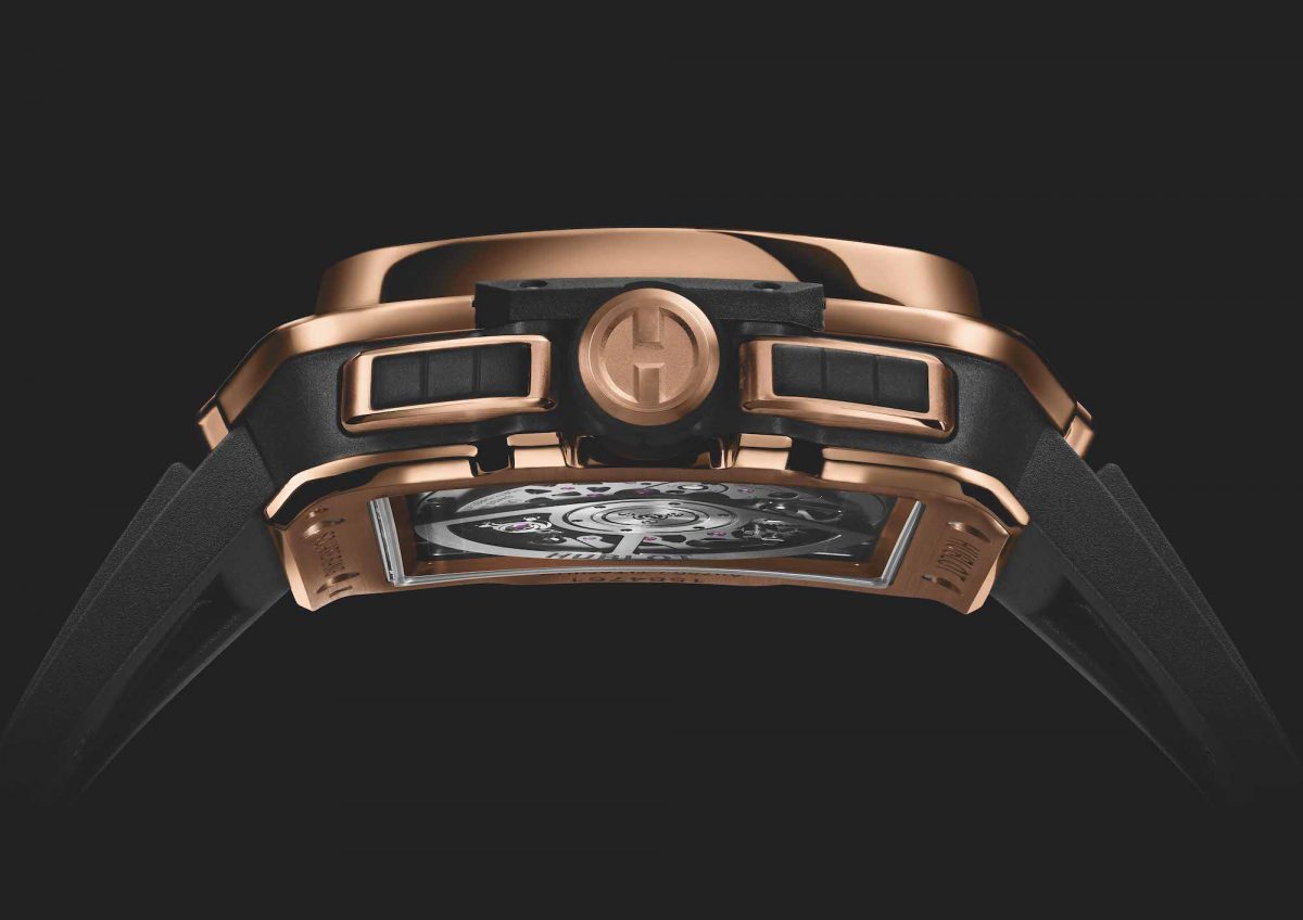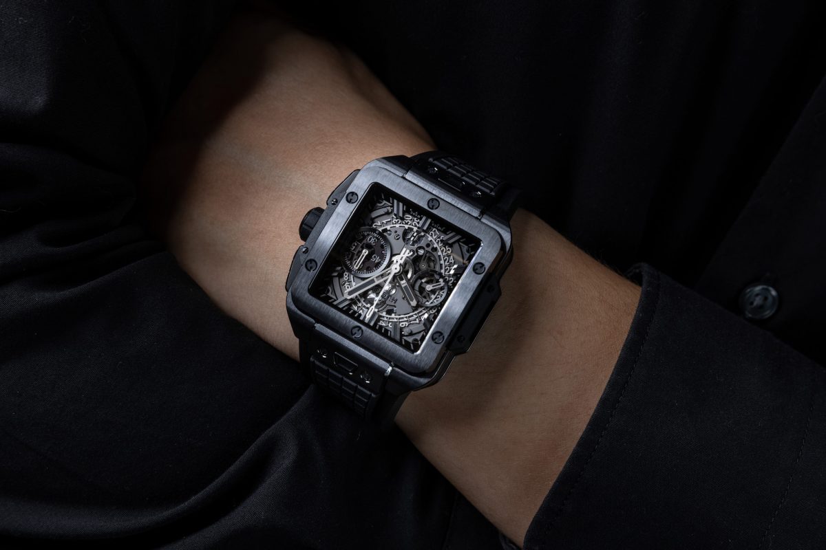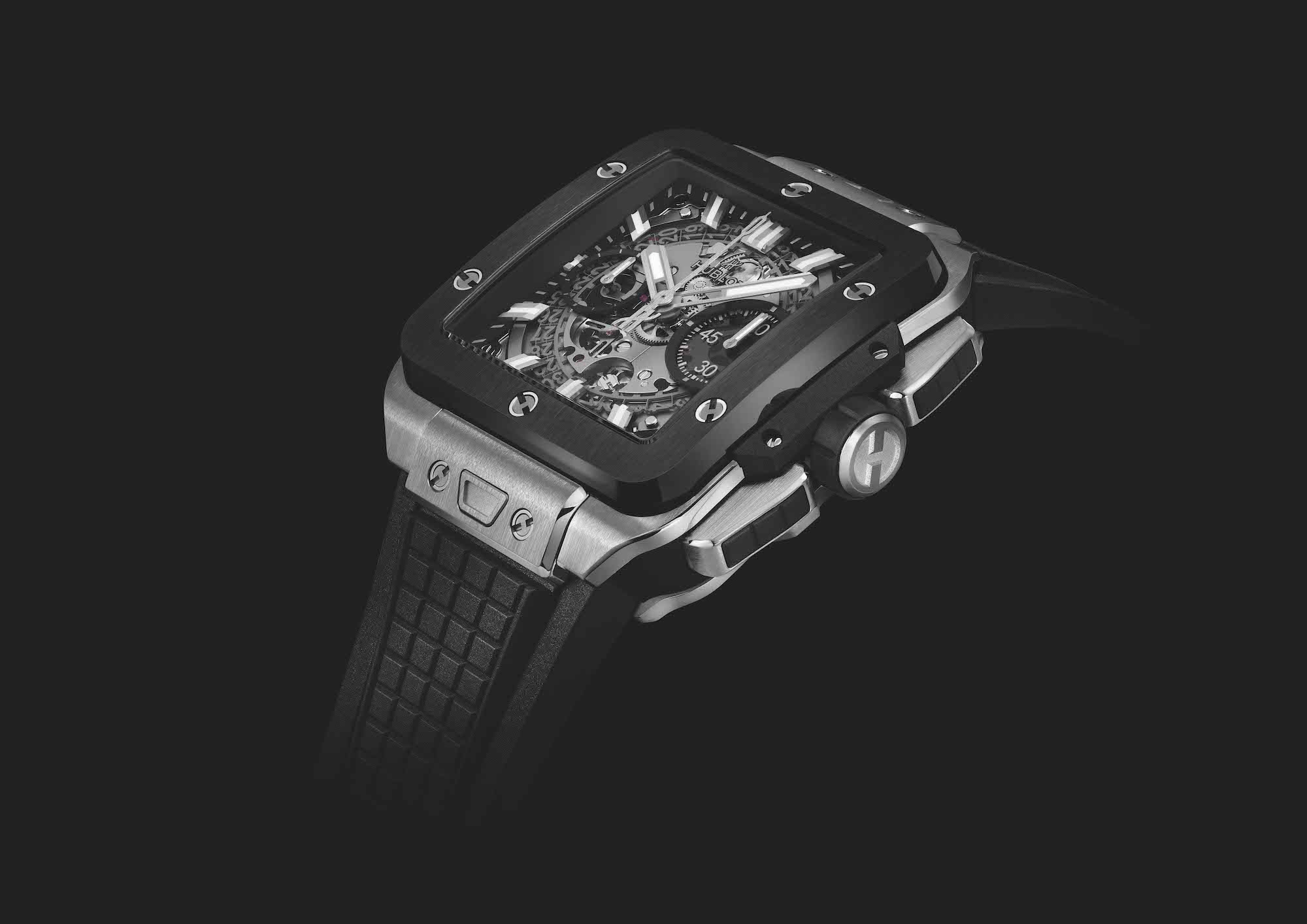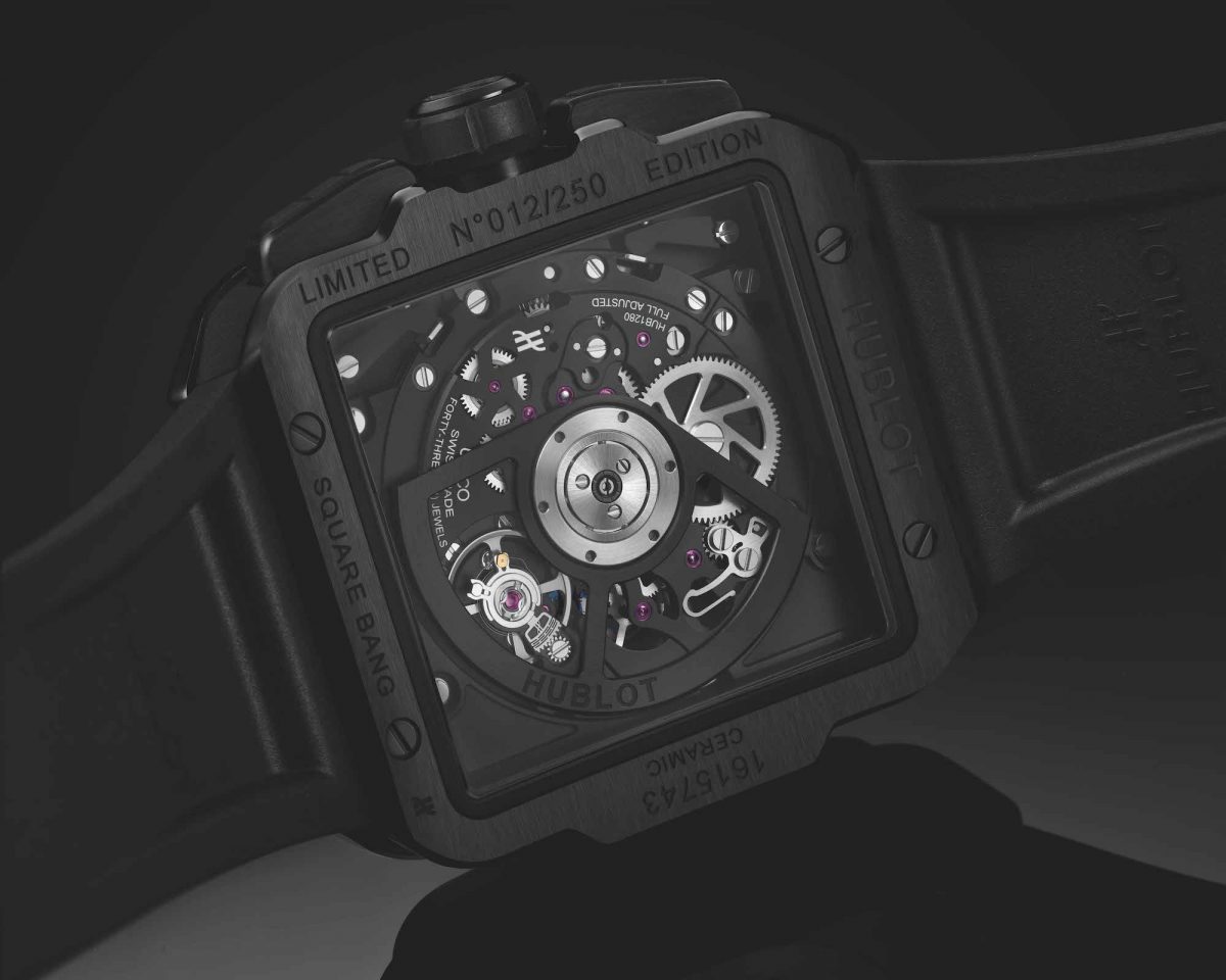 要打造出方型的Square Bang Unico系列首先面臨的挑戰便是機芯。由於構成機芯的基礎零件為圓形齒輪,因此機芯以圓形呈現,而將圓形機芯和諧美觀地置於方形錶殼內,並且為鏤空面盤,需要成熟卓越的製錶工藝。