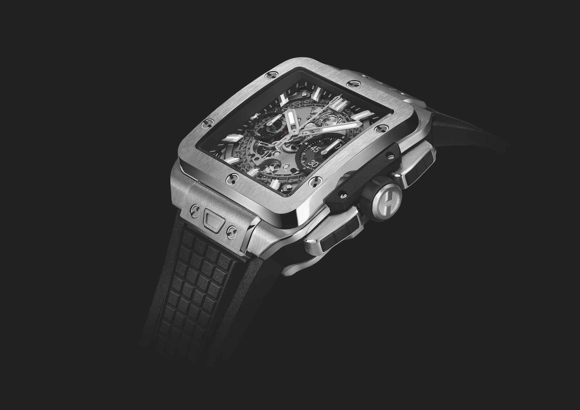 其中包括拋光及緞面髮絲紋處理,微噴砂螺絲細節、以及鍍銠或鍍5N金的指針(取決於不同錶款)。然而方形和圓形錶殼相比,更難實現防水功能,但宇舶成功克服了這項挑戰,並賦予Square Bang Unico 系列100米的防水深度。