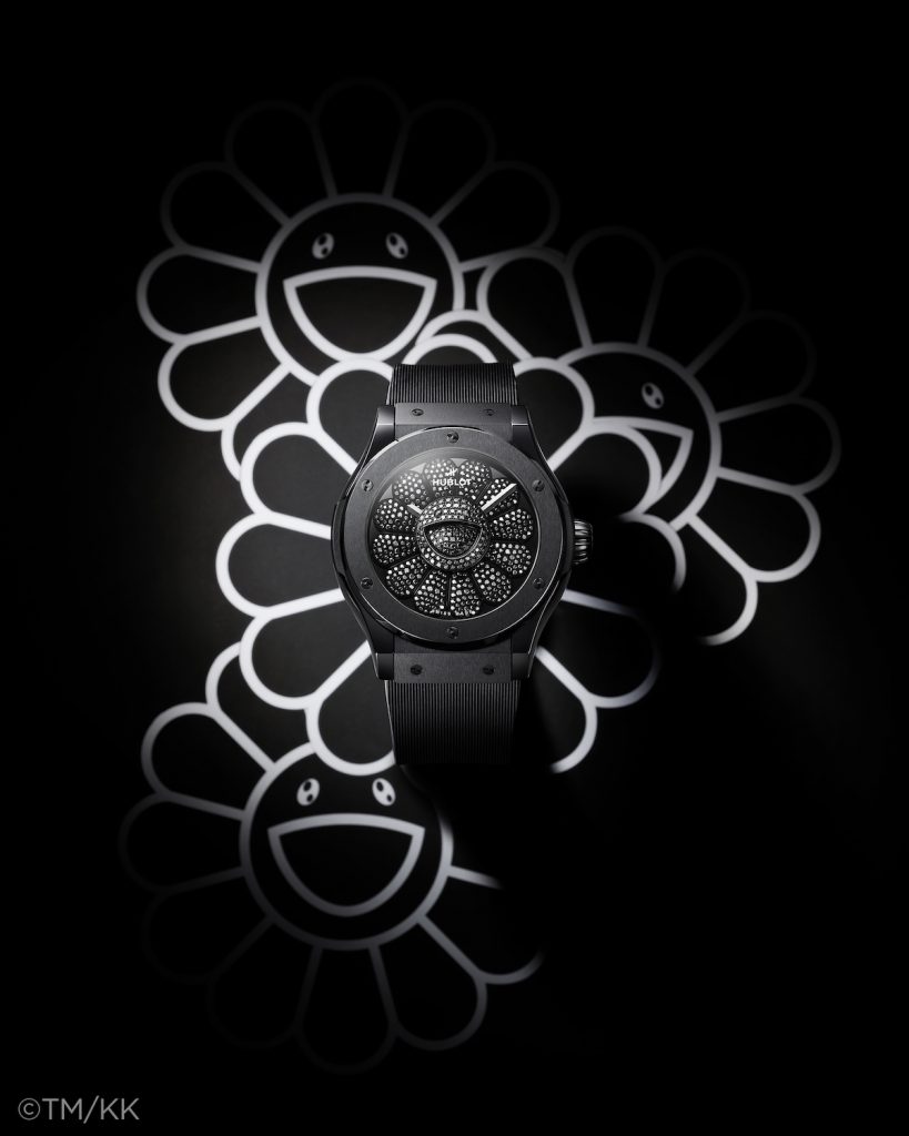 宇舶錶再次引領腕錶潮藝術,攜手全球著名潮流藝術大師村上隆,呈現經典融合系列村上隆All Black聯名腕錶。以宇舶著名All Black 全黑拋光陶瓷錶款,與藝術家標誌性的藝術圖騰「微笑之花」為主題,搭載自製UNICO機芯,並運用獨家研發滾珠軸承系統,使得花朵得以旋轉,營造特殊立體效果,近600顆黑鑽鑲嵌於花瓣和花蕊,以精湛製錶技藝演繹當代潮流藝術美學,彰顯品牌精神”融合的藝術”。