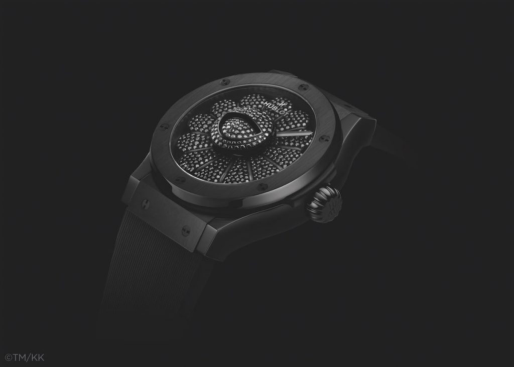 經典融合系列村上隆All Black聯名腕錶,採用宇舶錶2016 首創「All Black全黑」風格,同時也是村上隆經常運用色調。面盤上鑲嵌456顆黑鑽的花瓣和107顆黑鑽的花蕊,反映潮流藝術中奢華的街頭元素,極具視覺渲染力。