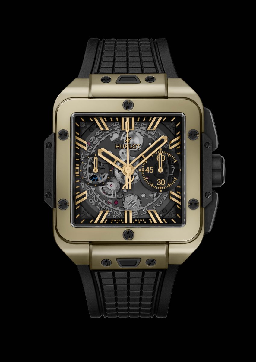 Square Bang Unico魔力金計時碼錶是瑞士中央貴金屬監管局認證的18K黃金合金,完全由宇舶高科技鑄造廠製造,為世界首款也是唯一抗耐刮擦的18K黃金合金。其硬度高達1000維氏硬度,遠高於傳統18K黃金的400硬度和硬化鋼600硬度,這種特殊材質確保即使隨著時間流逝,腕錶依然能保持其璀璨光澤。堅固的方形樑框式錶殼,細膩的圓弧邊角處理,藉由魔力金的抗刮擦特性,刻意加大錶圈厚度與尺寸,呈現立體錶圈,鮮明地突顯錶殼的幾何形狀。錶圈上飾有6顆標誌性的鈦金鍍黑H型螺絲,多層次鏤空面盤,以及One Click單鍵快拆錶帶裝置。搭載自製UNICO飛返計時機芯,提供準確計時和日期顯示,將耐用性與奢華完美結合,再次彰顯品牌高階奢華運動腕錶的鮮明特色。