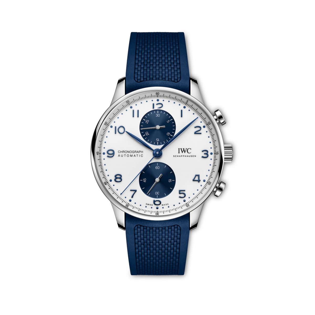 IWC葡萄牙系列計時腕錶(型號IW371620)採用直徑41毫米精鋼錶殼、白色及藍色錶盤,以及藍鋼葉形指針。分鐘計時盤位於12點位置,小秒針在6點鐘位置。在錶殼內運作的是IWC萬國錶自製69355型自動上鏈機芯,動力儲備為46小時。計時機芯配備經典導柱輪結構,可透過藍寶石玻璃底蓋一覽無遺。此外,這款優雅的運動腕錶配備耐用且彈性十足的藍色橡膠錶帶,可在夏天提供出色的佩戴舒適度。