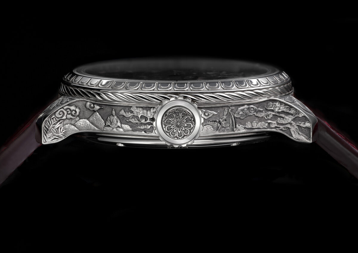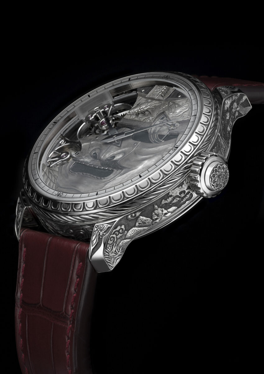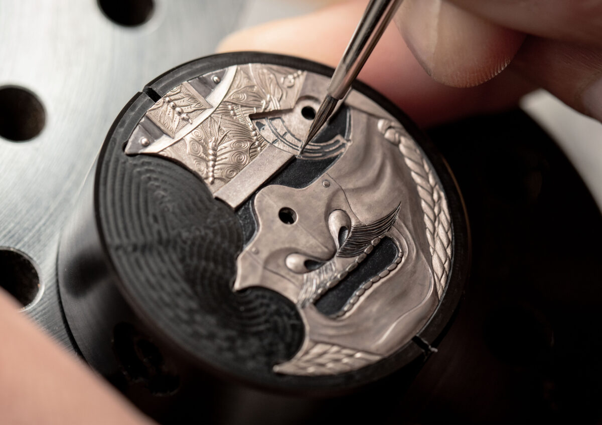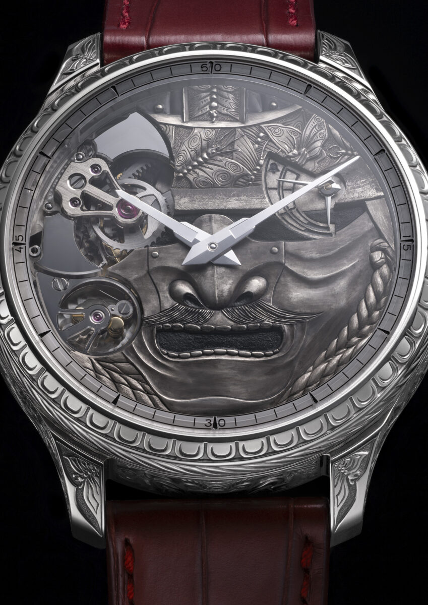 錶殼中層化作一幅微縮雕刻壁畫,激烈戰場與靜心冥想的場景交錯呈現,深刻闡述了武士紀律與精神求索的二元性。錶耳之間,刻有令人敬畏且具守護意義的「鬼」(oni),以極致入微的筆觸,將日本民間傳說中的神靈活現眼前,默默守護著武士。錶圈延續了這份沉浸式美學,其圖案靈感源自傳統盔甲,如扁平的「毛引威」(kebidi odoshi)編繩,以及讓人聯想起古代面具的裝飾。經手工潤飾的機芯展現了形象化的海浪圖騰與神話動物「狛犬」——宛如守護聖殿的祥獅;錶冠之上則精雕細琢出一朵牡丹,象徵榮譽、勇氣與力量。這枚珍品的每一方寸,皆是對日本美學與精神的致敬;雕刻在此化作一種語言,而時計,則是一首雋永的立體敘事詩。