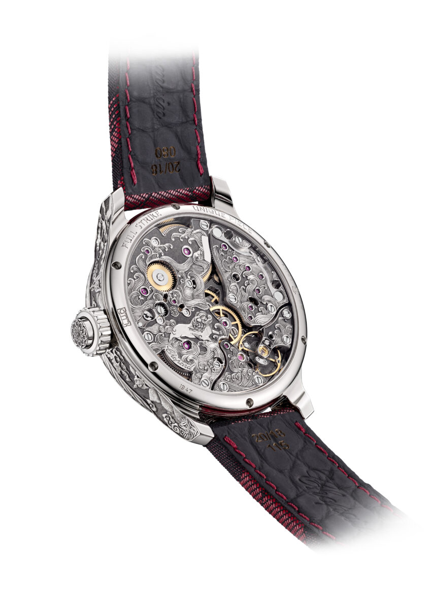 這款L.U.C Full Strike「武士精神」腕錶由內而外皆精緻考究,搭載蕭邦錶廠於2016年推出的超凡機芯,特別以手工雕刻傳統圖案加以昇華。L.U.C 08.01-L型機芯是一款三問報時機械機芯,自鳴報時、刻和分鐘的音色猶如水晶般清澈剔透。事實上,保護錶盤的水晶玻璃錶鏡和鳴響報時的音簧形成一體。腕錶由同一塊藍寶石水晶加工而成,不經焊接,無需螺絲或黏貼劑接合,為腕錶賦予獨一無二的奏鳴響度。這個永固無損的報時佈局結構是蕭邦所獲的眾多專利之一,而L.U.C 08.01-L型機芯歷經15,000小時方才構想成型。2017年,L.U.C Full Strike腕錶玫瑰金款獲頒日內瓦高級鐘錶大賞「金指針獎」,是對蕭邦製錶的肯定。
