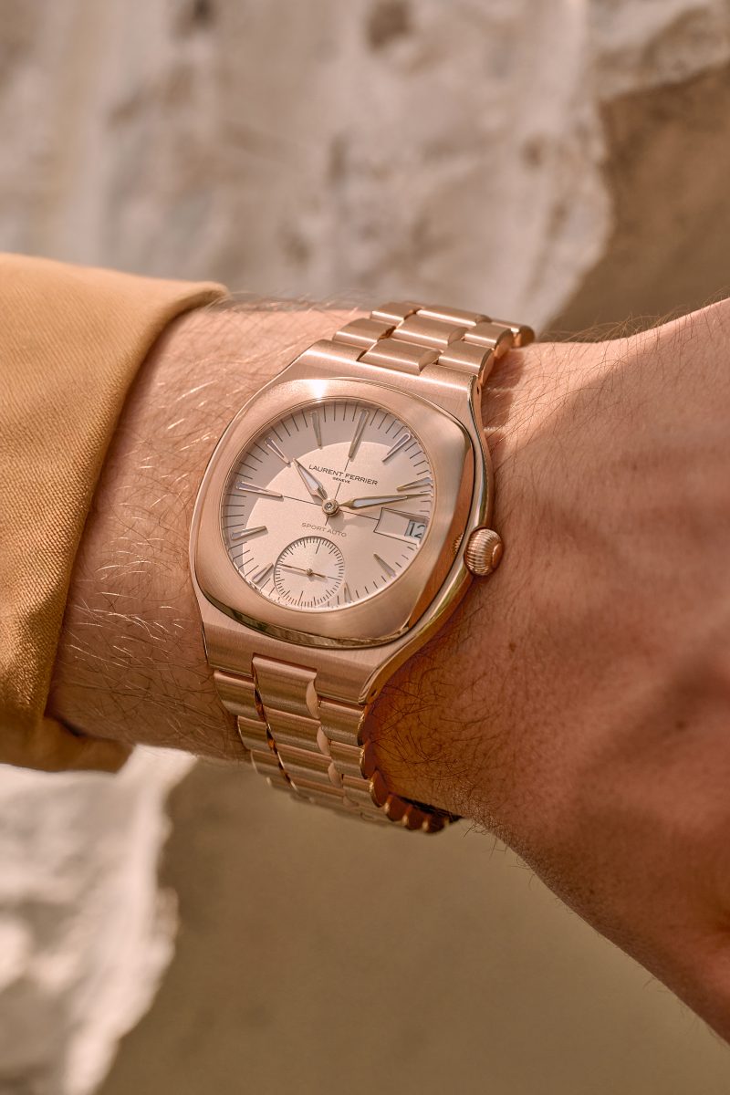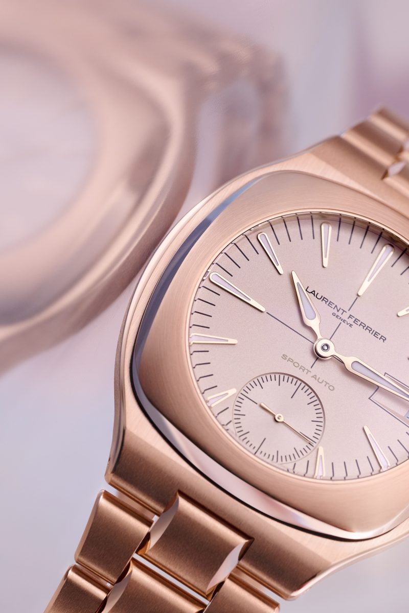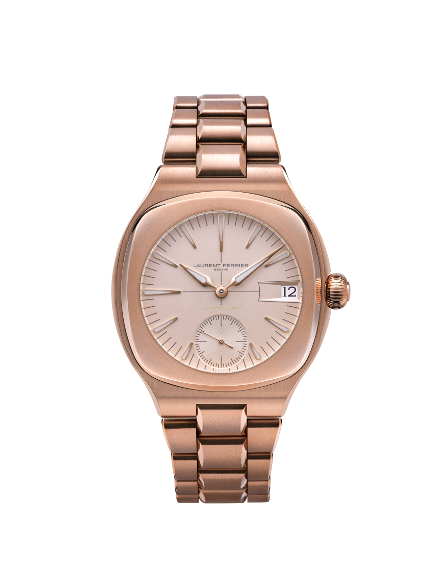 這款以 5N 紅金打造的 Sport Auto 腕錶搭載 LF270.01 自動機芯,具備微型自動盤,由 LAURENT FERRIER 日內瓦工坊自主設計、修飾與組裝。這枚穩健而精準的機芯,搭載瑞士槓桿擒縱系統與950 鉑金微型自動盤,並以手工修飾完成每一道細節。自動盤表面飾以雷射雕刻,若細心觀察,會發現其中隱含向 1979 年賽事致意的數字密碼。